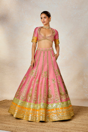 Description: The Rose Thandai lehenga is a dusty pink heavily embellished lehenga set on a silk background with motifs inspired by 'Chand-phool', 'Sehra','Amaltas' realized through sitara and moti embroidery. Finished with a contrast ochre border that adds some whimsy, this is for the bride who prefers subtle glamour whilst remaining true to her traditional roots.