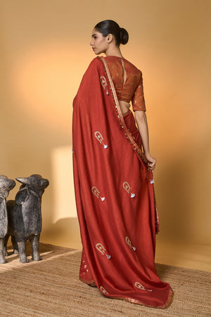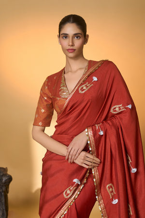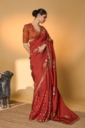 Details: A graceful saree featuring a smooth, elegant drape with refined detailing throughout. The pleats are adorned with small foil motifs, adding subtle texture and shine. The pallu has embroidered motifs highlighted with tassel accents for added charm. A decorative border with coin-like accents enhances the structure of the saree. The blouse is designed with coordinated embroidery on the neckline and sleeves.