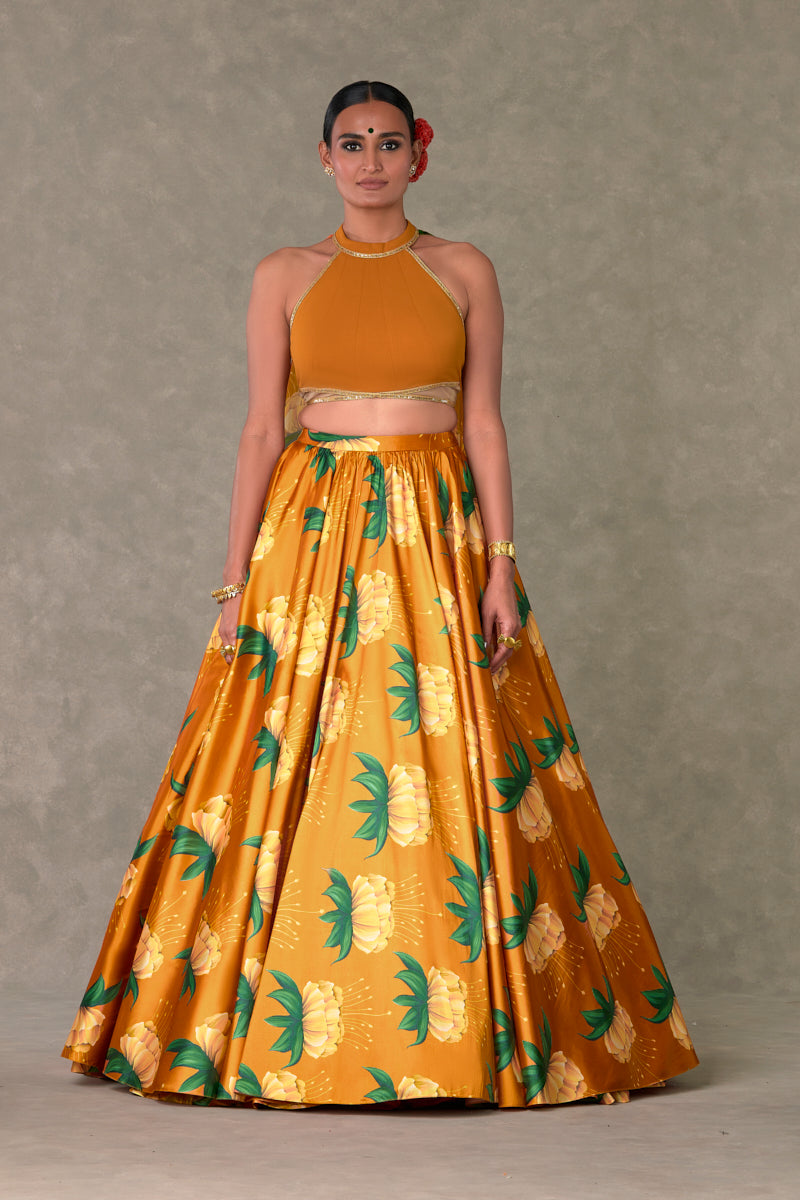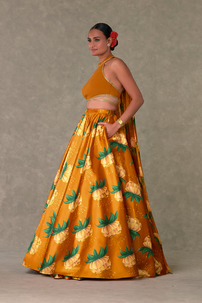 Details: Rust Masakali Skirt Set - All over digital printed skirt |Circular skirt with light gathers around the waist | Side zip closure | Pocket detail |Comes with a separate can skirt. Busteir- Zero neckline bustier embellished with Sitara border | In-cut sleeves | Centre back closure with detachable organza drape