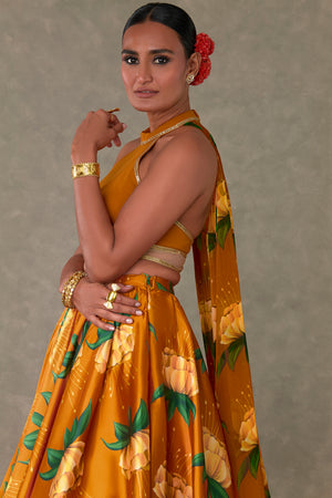 Details: Rust Masakali Skirt Set - All over digital printed skirt |Circular skirt with light gathers around the waist | Side zip closure | Pocket detail |Comes with a separate can skirt. Busteir- Zero neckline bustier embellished with Sitara border | In-cut sleeves | Centre back closure with detachable organza drape