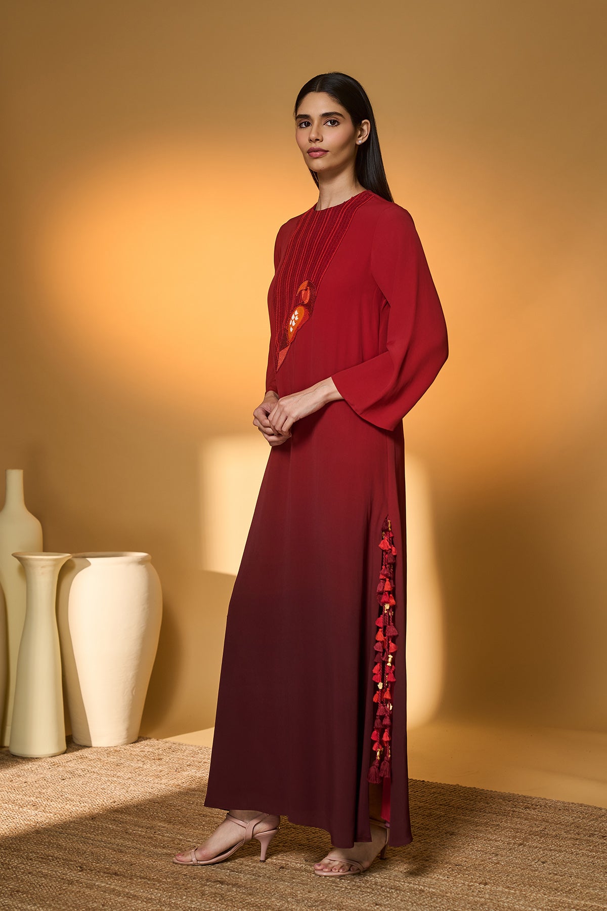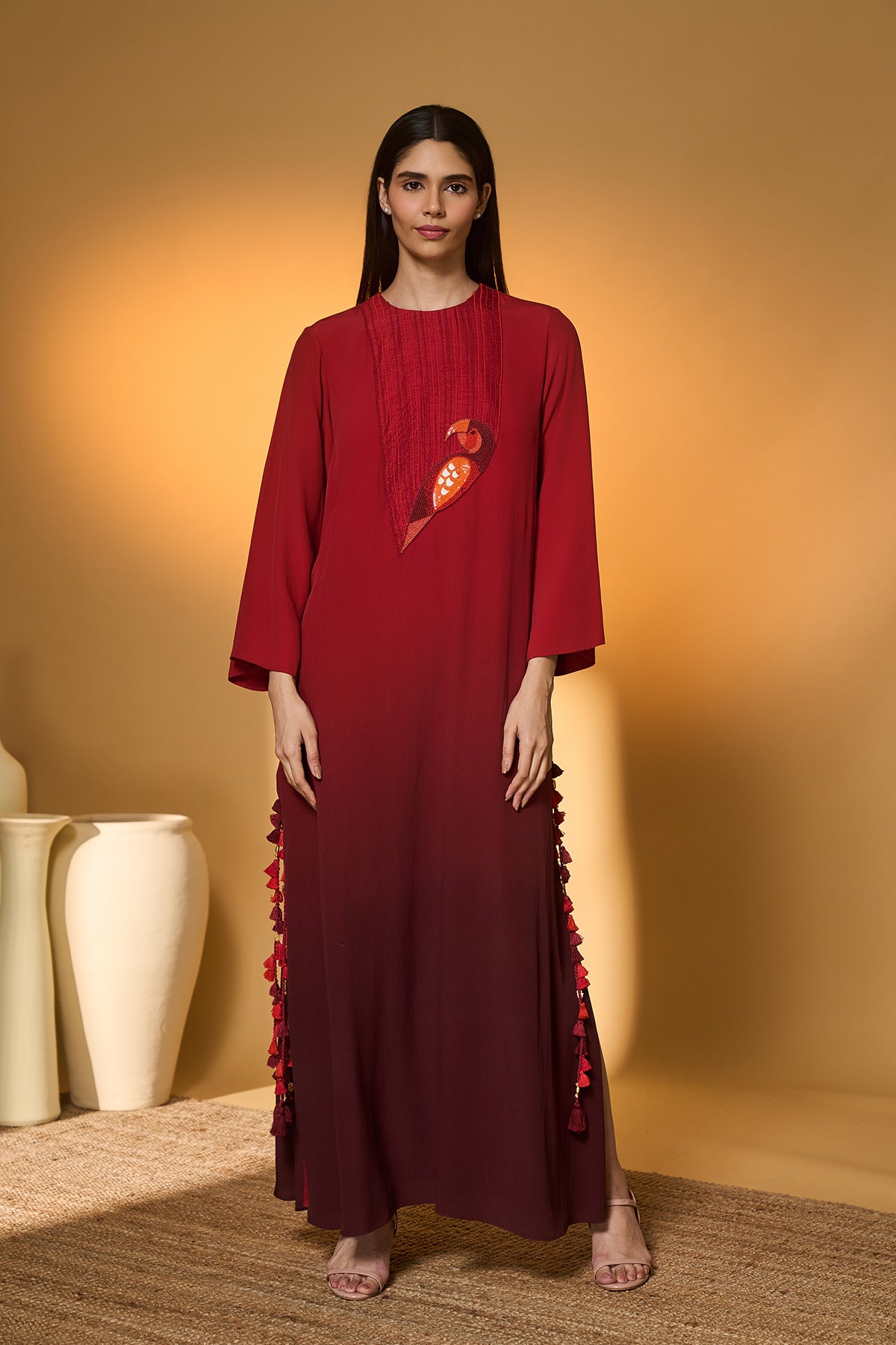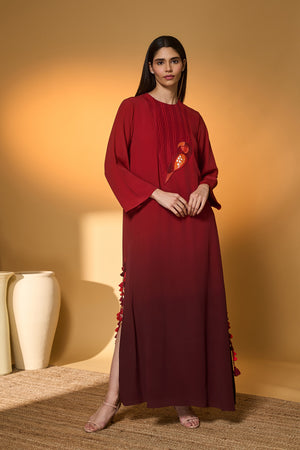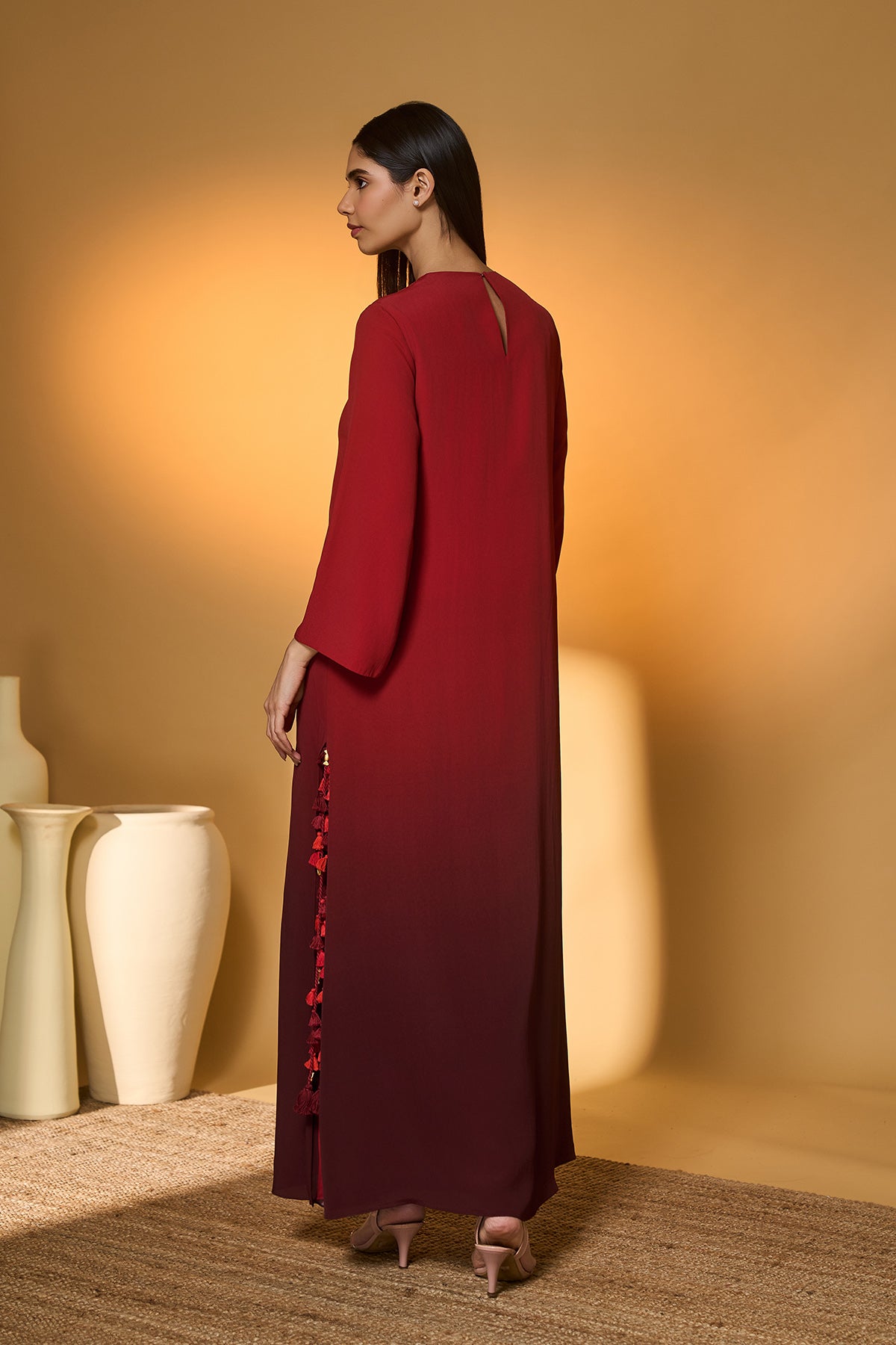 Details: Kaftan-Straight kaftan | High slit Adorned with tassels | Digital print ombre red with a placement of a flock on yoke | along with embroidered yoke
