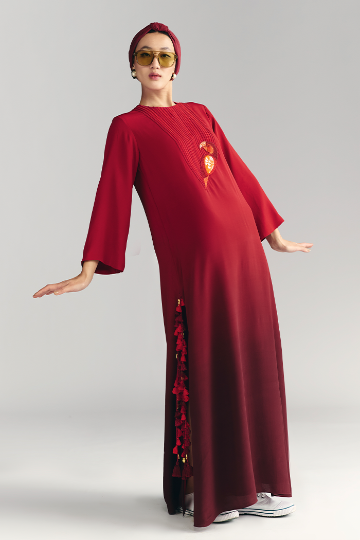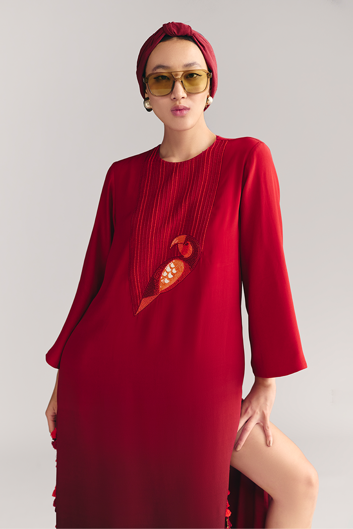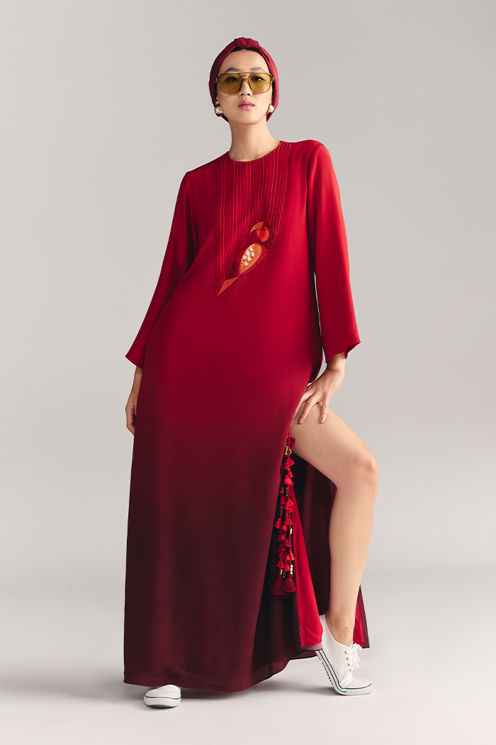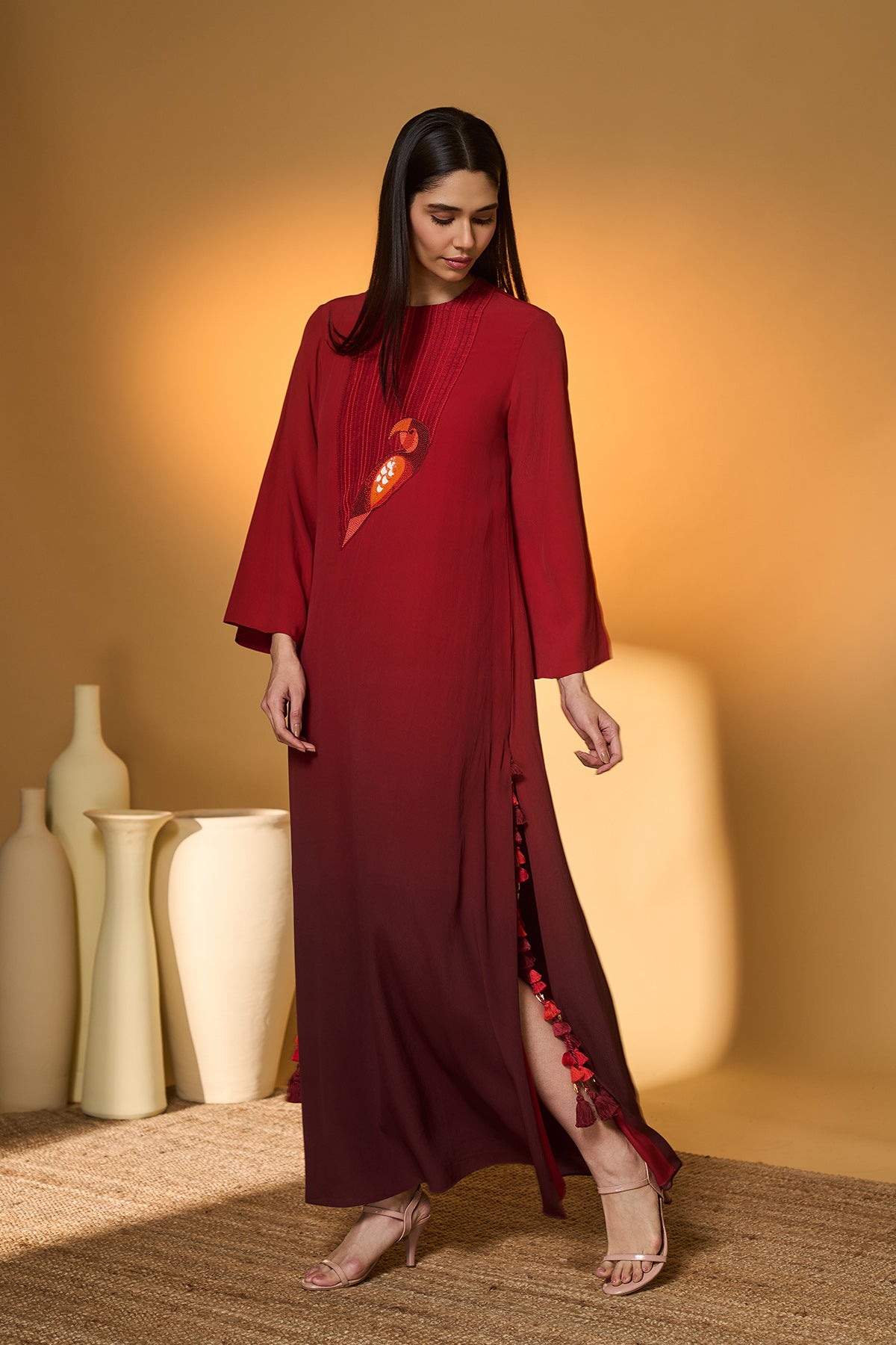 Details: Kaftan-Straight kaftan | High slit Adorned with tassels | Digital print ombre red with a placement of a flock on yoke | along with embroidered yoke