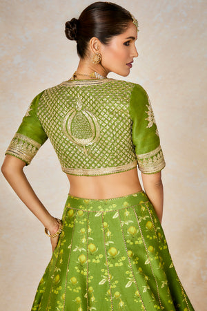 Details: Lehenga- Digital printed patchwork lehenga adorned with Chaand-Phool and Jhaali in gold dori, sitara & moti kaam| Embellished with embroidered border and edged with kinari |Side zip closure | Pocket detail | Comes with a separate Can Can skirt Blouse- Blouse adorned with sitara kaam |'V' neckline |Elbow sleeve | Printed lining Dupatta- All over digital printed Organza dupatta | Embellished with embroidered border and edged with kinari |Tassel detail