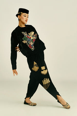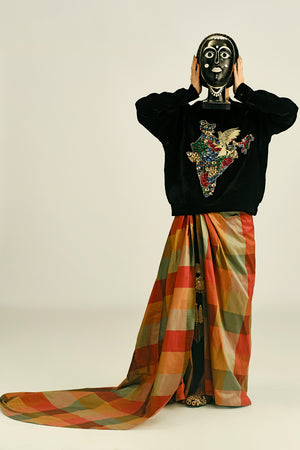 Details: Jumper- A sumptuous velvet jumper, exquisitely hand-embroidered with a vibrant India map and iconic Son Chidiya motifs, adorned with a cascade of colorful crystal stones for a striking, artisanal finish. Dhoti Pants- Opulent velvet dhoti pants, artfully detailed with hand-embroidered tassels and delicately suspended crystals, blending traditional craftsmanship with contemporary elegance. Drape- A sophisticated drape crafted in a veshti-inspired silhouette, designed to layer gracefully over pants, rendered in a checks-patterned dupion silk for a contemporary yet timeless appeal