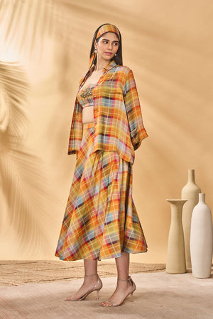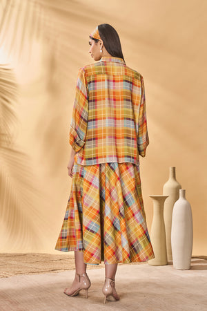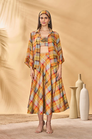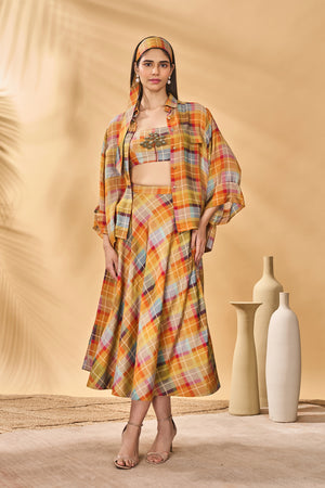 Details: Safari shirt | Half sleeves with folded hem | Patch pockets on front | Front button closure Tube bustier with adjustable straps | Embroidered body | Centre back closure Circle skirt | Flared | Side zipper closure