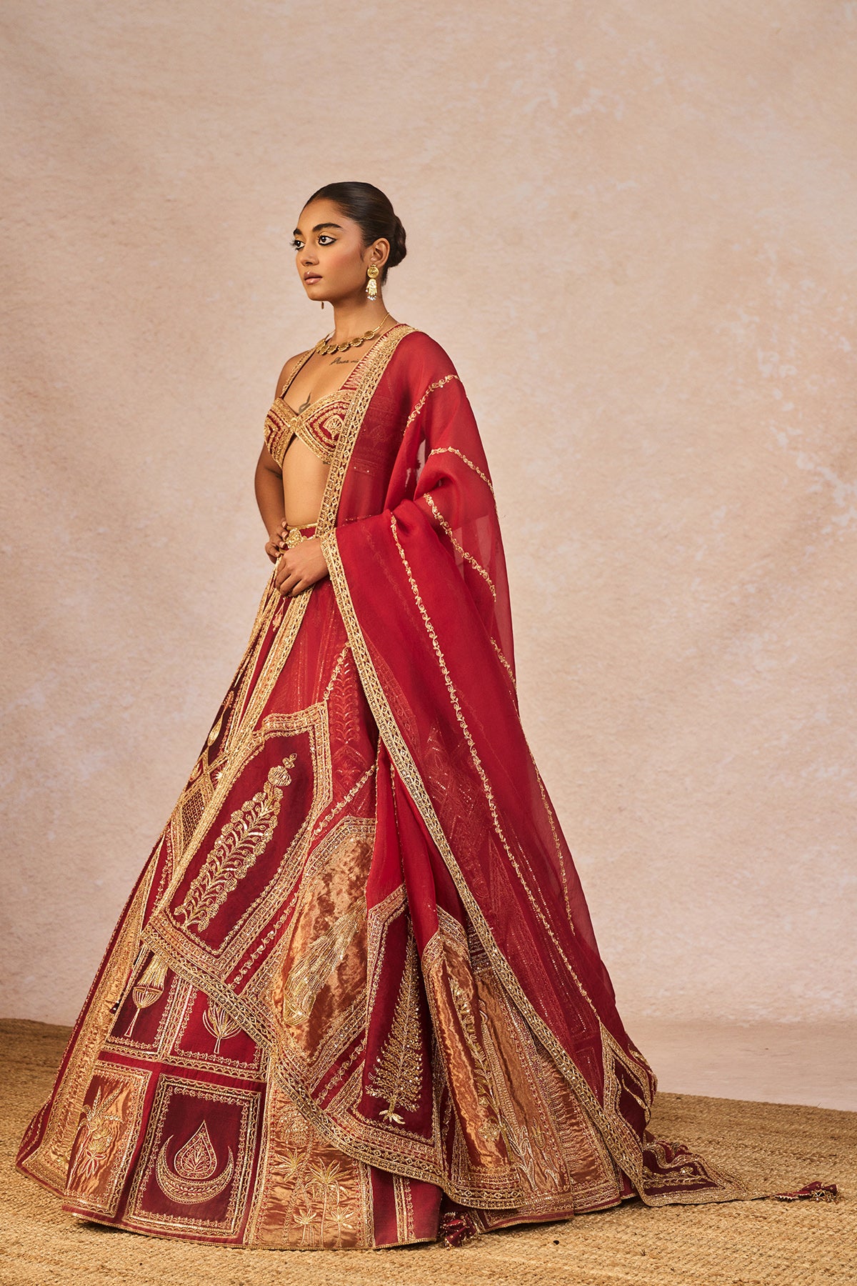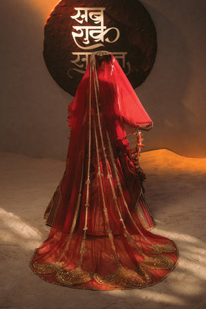 Description: This vibrant 'Tenu Takdi Ravah' Lehenga features a rich interplay of different shades of red,and intricately embroidered 'Mithi Makaai', 'Paankh Bagh', 'Gul Jharokha' and "Kashmiri Kali' motifs, crafted from tissue fabric that add depth and texture to the silhouette. Paired with a complementary blouse, the ensemble strikes a perfect balance of traditional richness and modern elegance. The dupatta enhances the look with a patchwork of red-toned organza and tissue panels, each box detailed with intricate gold embroidery, adding a complete finish that beautifully ties the entire outfit together for festive and celebratory occasions.