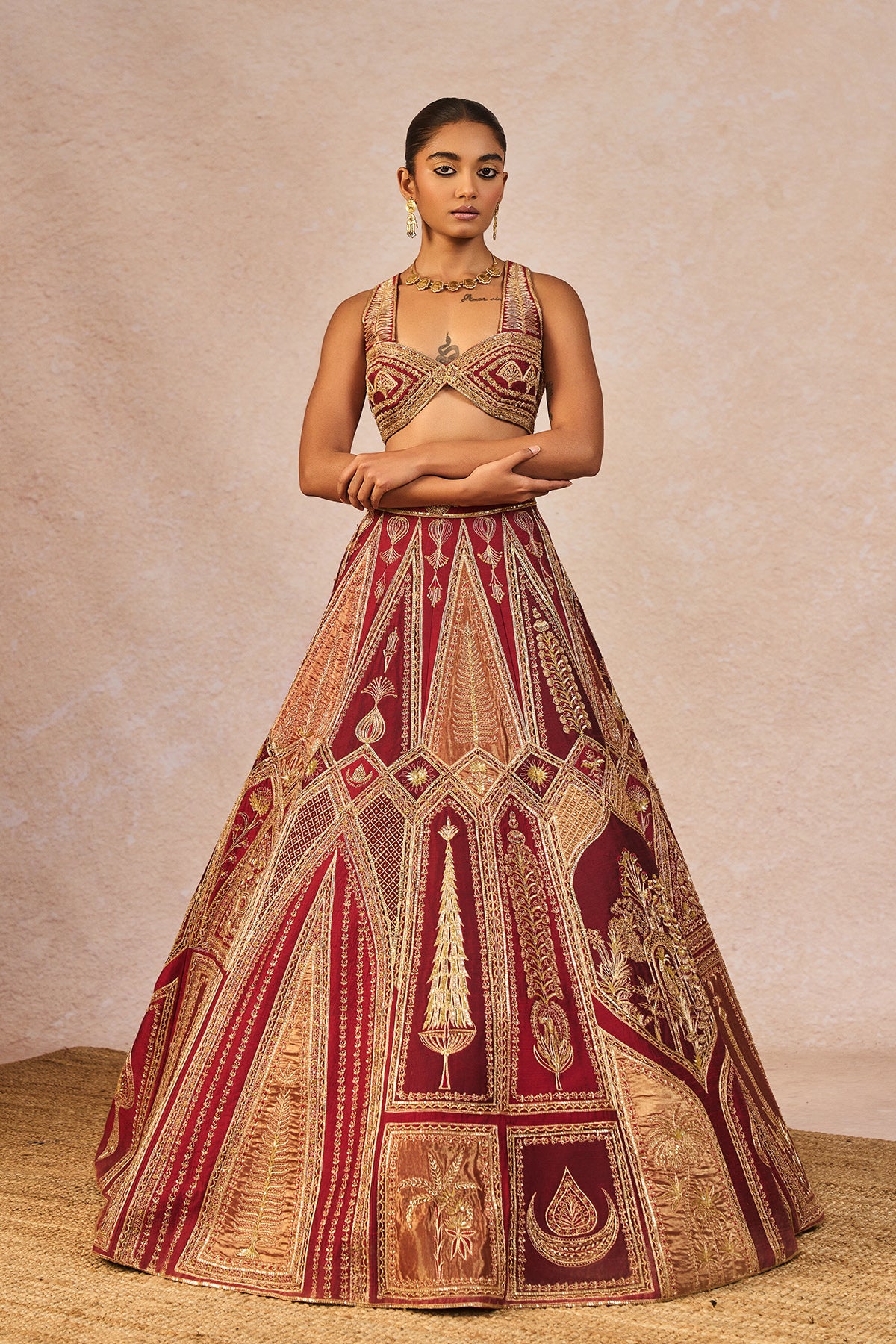 Details: The 'Tenu Takdi Ravah' Lehenga Set- Lehenga intricately embroidered with multiple 'Gul Jharokha' & 'Mithi Makaai' motifs in geometric layout| Embroidered Patchwork on different shades of red| 12 Kalis | Side Seam zipper closure | Side pockets | Comes with a separate Can Can skirt, Blouse- Pentagon neckline |Embroidred Halter strap| Back opening detail | Centre back closure. Dupatta- Red organza with embroidered striped body and different Gold tissue Patchwork with 'Jharoka' motifs.