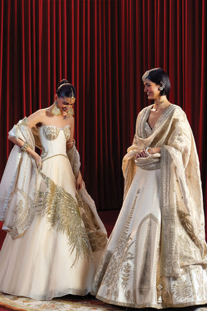Description: This 'Tera Khayal' Lehenga is a blend of elegance and symbolism, featuring gold tissue patch with intricately embroidered which has the signature 'Son Chidiya' motif delicately perched atop a 'Chaand' motif, creating a striking visual narrative. Styled with a structured ivory corset adorned with finely embroidered 'Chaand Phool' motifs on both corners, the ensemble exudes modern grace rooted in tradition. It is completed with a trio of ivory-toned organza dupattas, each subtly embellished with'Son Chidiya' motifs, adding layers of lightness and meaning to this ethereal and thoughtfully designed look.