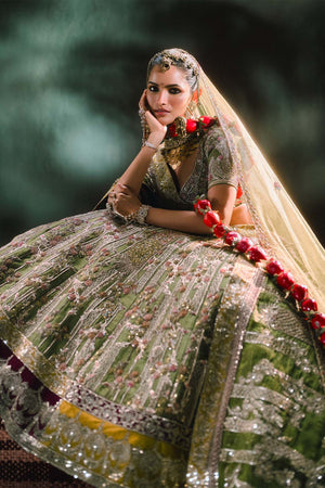 Description:The Aam Panna Lehenga- like its name is bursting in flavour and vivacity, this lehenga is embelished in sequins work and Naga tiki work thats further highlighted in delicate pink sequins, this lehenga brings to life the tropical richness of indian wilderness. With mismatched borders skirting the hem, and an intricately embroidered choli- this lehenga is for the carefree bride who isn't afraid of self expression. Comes with a separate cancan.