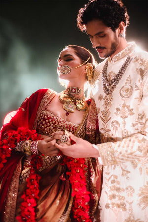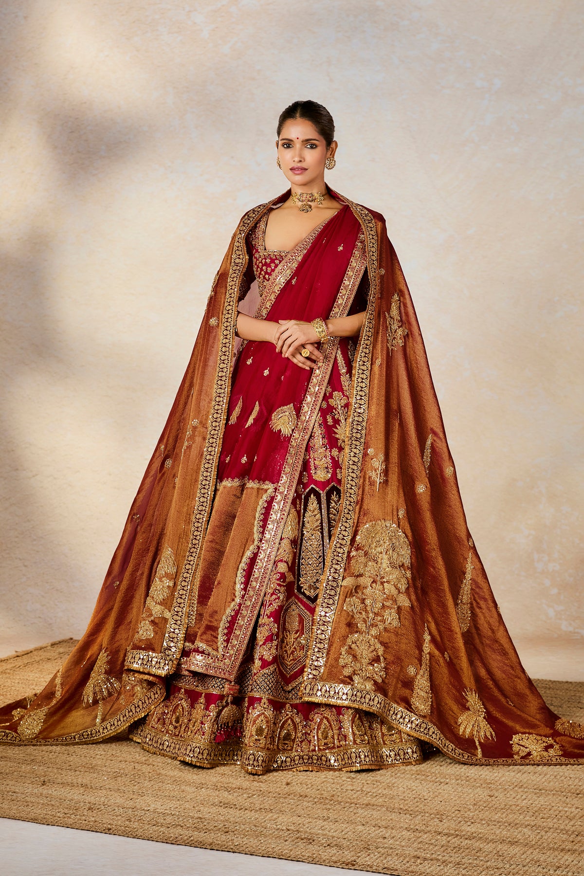 Fabric: Lehenga- Heavy Raw Silk, Silk Velvet & Georgette Tissue | Blouse- Heavy Raw Silk, Silk Velvet & Georgette Tissue | Dupatta 1 - Georgette Tissue | Dupatta 2- Silk Organza & Georgette Tissue | Veil- Tulle