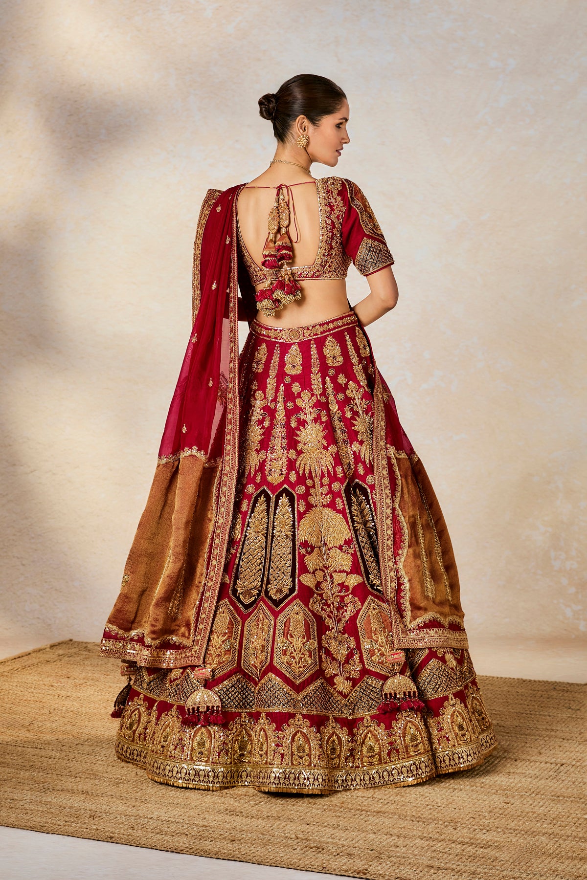 Description:Resplendence takes a rare form in this ornate ensemble. The Anar Bagh lehenga is a velvet patchwork lehenga adorned with our Anant Bel and Anasam Rekha motifs, which has tissue inlays running across the the bottom of the lehenga. Our Baug Taj motifs are intricately embroidered on the tissue and finished with a jaal tissue patchwork. It's heavily embelished veil where our Nirjarapushp motif sways in the emotion of a bride. Comes with a separate cancan.