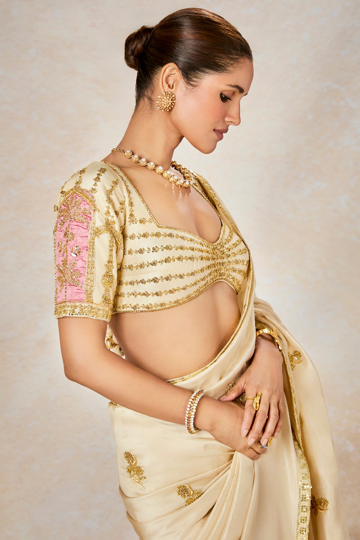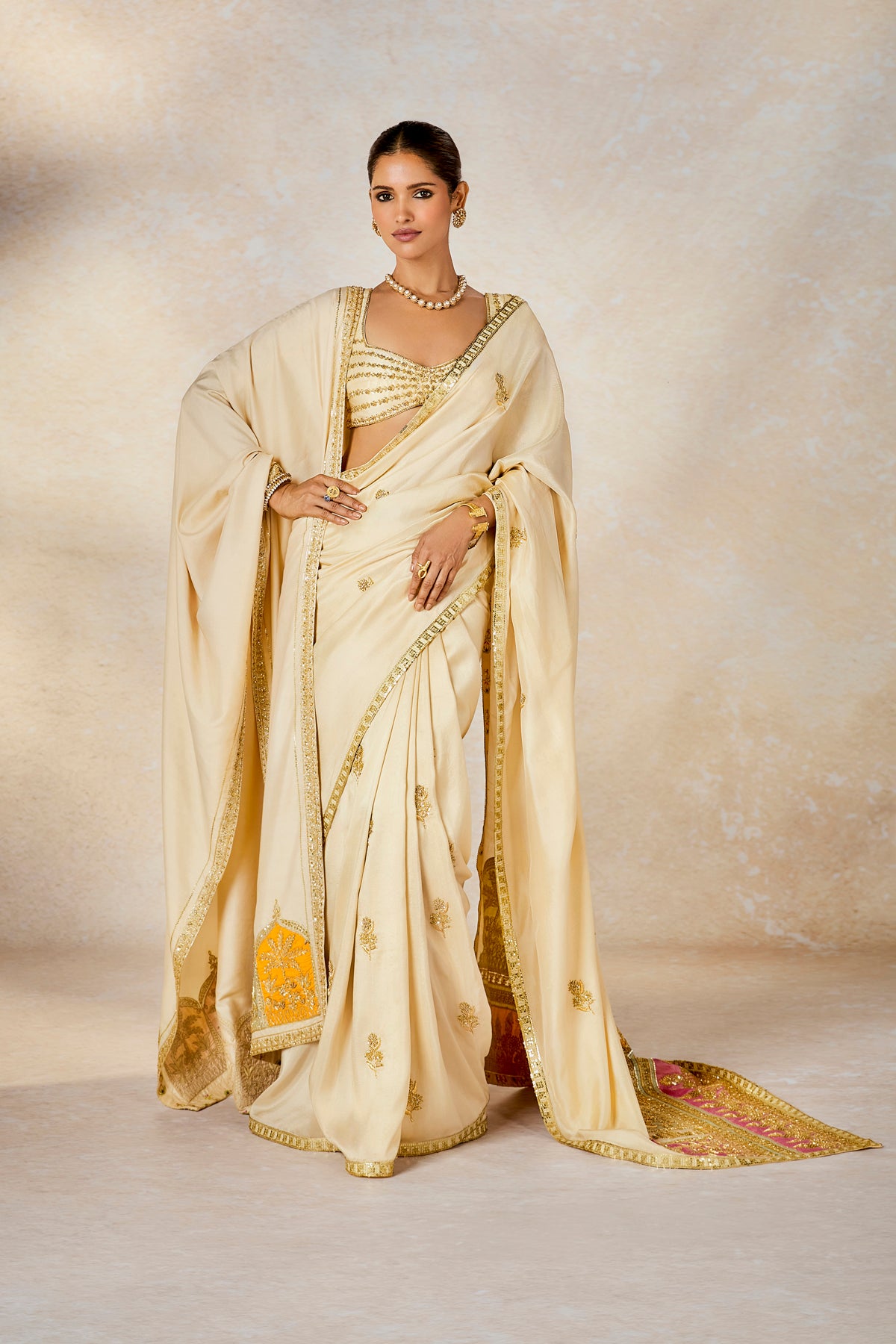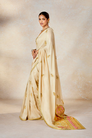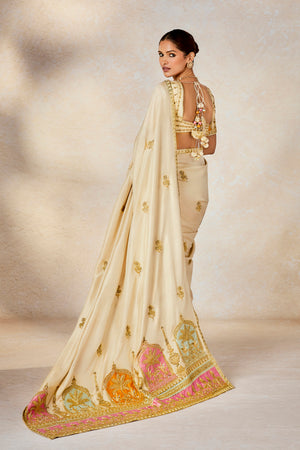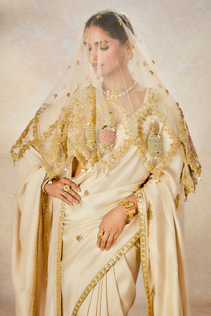 Description:In a dreamy hue, this angelic saree with patchwork 'Gul Jharokha' motifs on the pallu is a resplendent vision in itself. Embroidered in delicate gold for a vision in elegance, The Bombay Barfi saree is for a bride that is not afraid to be different at every occasion. Paired with a sweetheart neck blouse with, whimsical patchwork Jharokha on the sleeves, she is a vision in ivory. The veil is adorned with ananas motif in multicolor thread embroidery with cutwork detailing in hem. The stole is embellished with colour inserts in 'Gul Jharoka' motifs .