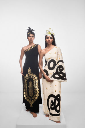 Details: Our unique ananas motif in a bold foil print nestled against a midnight black background in a sleek one shoulder and trouser set. Featuring our tribal pot mascots around the neckline, This ensemble is a sure standout at any festivity.