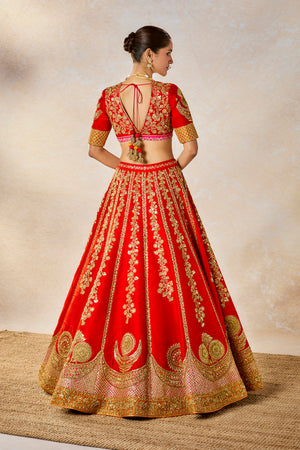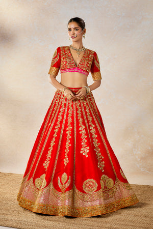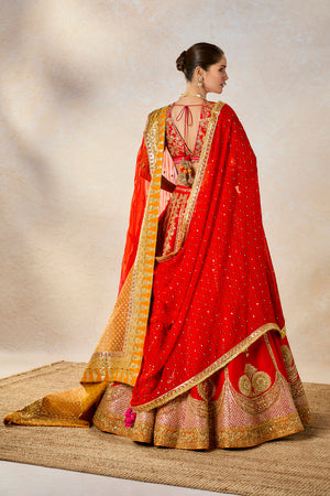 Description:The Gulab Sherbet lehenga pays homage to the traditional bride. The bride who isn't afraid to be bold and fearless. A classic in red, this lehenga is made in raw silk overlaid with a medley of our defining floral motifs and the Chand-phool motifs in gold. The unique patchwork dupatta with jaal work embroidered across the sunshine orange makes this lehenga perfect for a bride. Comes with a separate cancan.