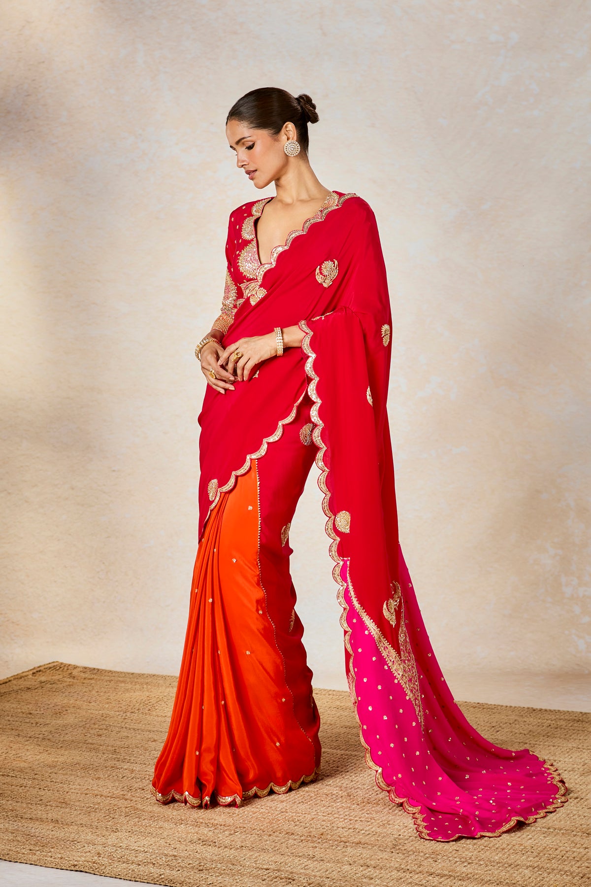 Description:Keeping tradition alive by blending a timeless hue with an eclectic aesthetic, consisting of a half and half colorblock of Reds, pinks and orange, The Gulab Sherbet saree is one of a kind. The Chand-phool motif taking center stage on the pallu with a scallop border in dainty gold. Paired with a similar patchwork blouse with jaal embroidery on the sleeve and and plunge V neck. The veil is adorned with bel motifs and jaal embroidery with red and pink patchwork.