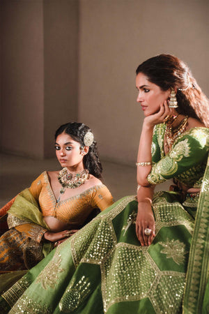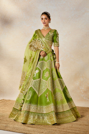 Description:Drawing inspiration from our house mascots that have been a part of our brand journey from the inception. With a beehive shaped jaal that runs across the 'Jaljeera' lehenga that delicately nestles iconic motif within it. It is paired with a deep V blouse embelished with zardozi and sitara work, the sleeves have a mixture of print and embroidery. A silk organza dupatta with dramatic florals embroidered in sitara embroidery is included. Comes with a separate cancan.