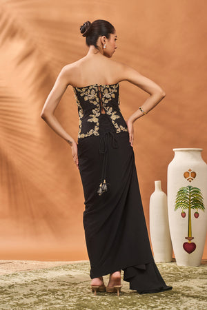 Description: Introducing The Kala-Khatta Corset Set, a captivating Indian fusion ensemble that blends traditional opulence with modern allure. This set features a structured corset, intricately adorned with gold embroidery inspired by the elegant 'Berry Bel' motif. The corset's design is elevated with exquisite gold work, crafted using zardozi, sequins, katdana and moti embroidery, creating a shimmering masterpiece that radiates sophistication. Paired with the corset is a draped skirt that adds a graceful flow to the ensemble, perfectly balancing the structured top. Completing the look is a delicate stole, adorned with two charming 'Anasam Phool' inspired motifs embroidered on the hemline, adding a playful yet refined touch. The Thandai Corset Set is ideal for festive occasions, weddings, or any event where you want to make a striking statement with a blend of tradition and contemporary style.
