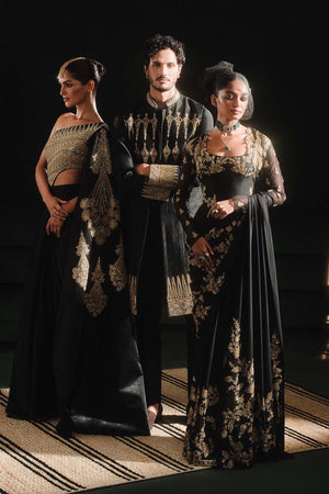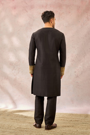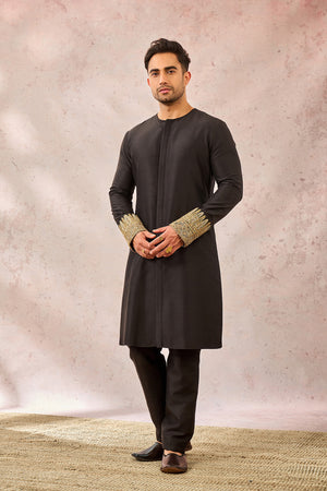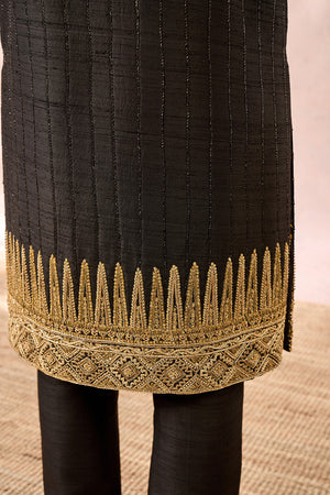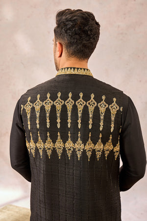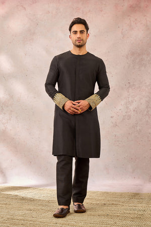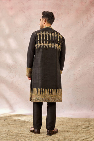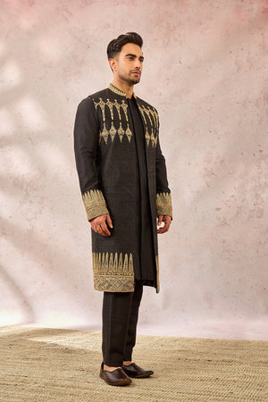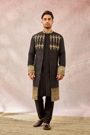 Description:The Kala Khatta long bandi is perfect for a sangeet night full of dancing and celebration! With the tricone border framing the hem and delicate lines running across the body with ornate linear motifs crowning the sherwani. This is an open bandi with an embelished kurta inside which makes it a perfect layered ensemble.