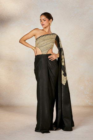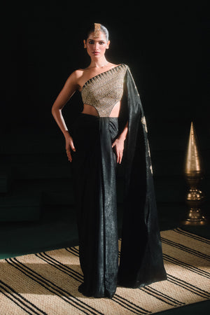 Description:The Kala Khatta Saree Gown defines tradition with a contemporary narrative. Inspired by the beautiful 'Kusum Kali' motif that showers down the pallu in bright gold sitara and moti embroidery. It has a one shoulder blouse that is elegant yet youthful and is completely embelished with our tricone border and a medley of motifs.