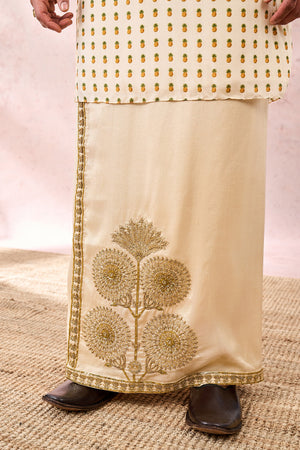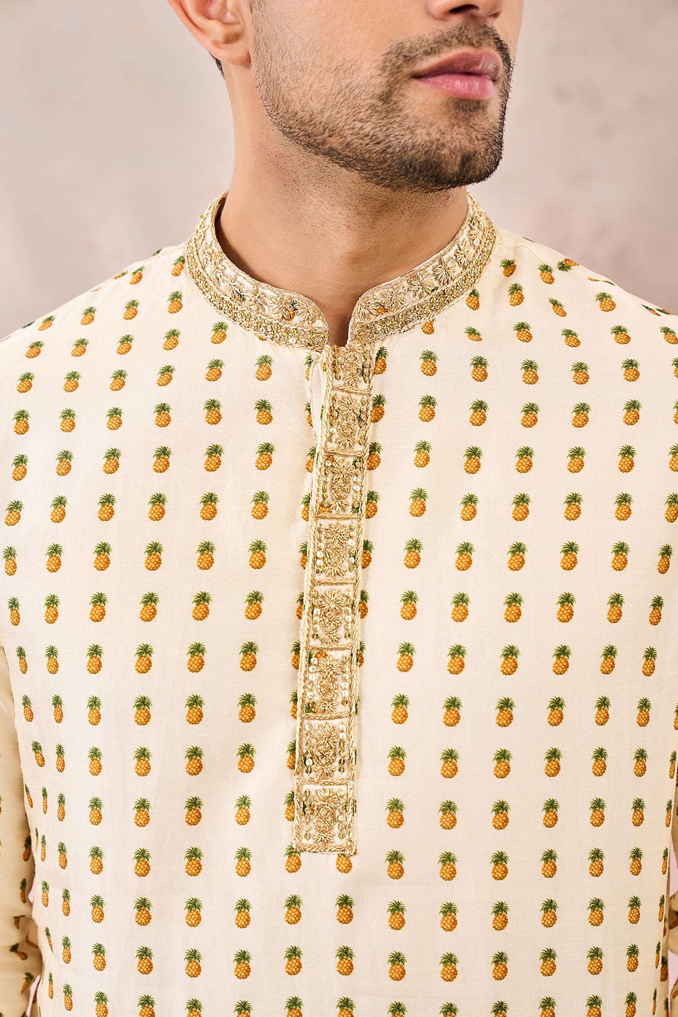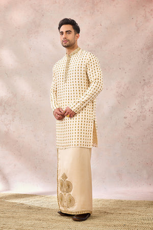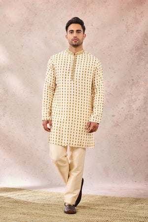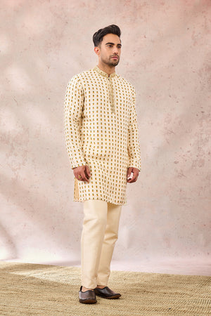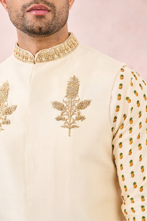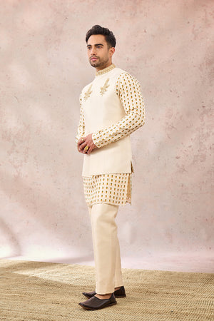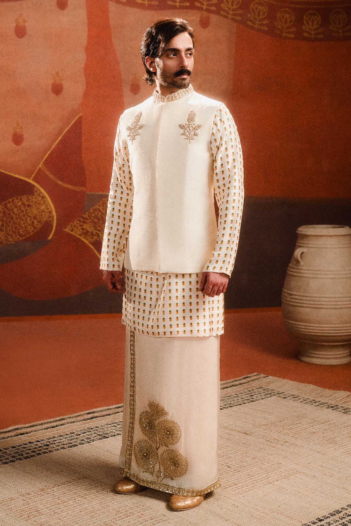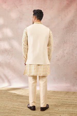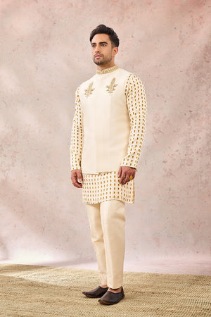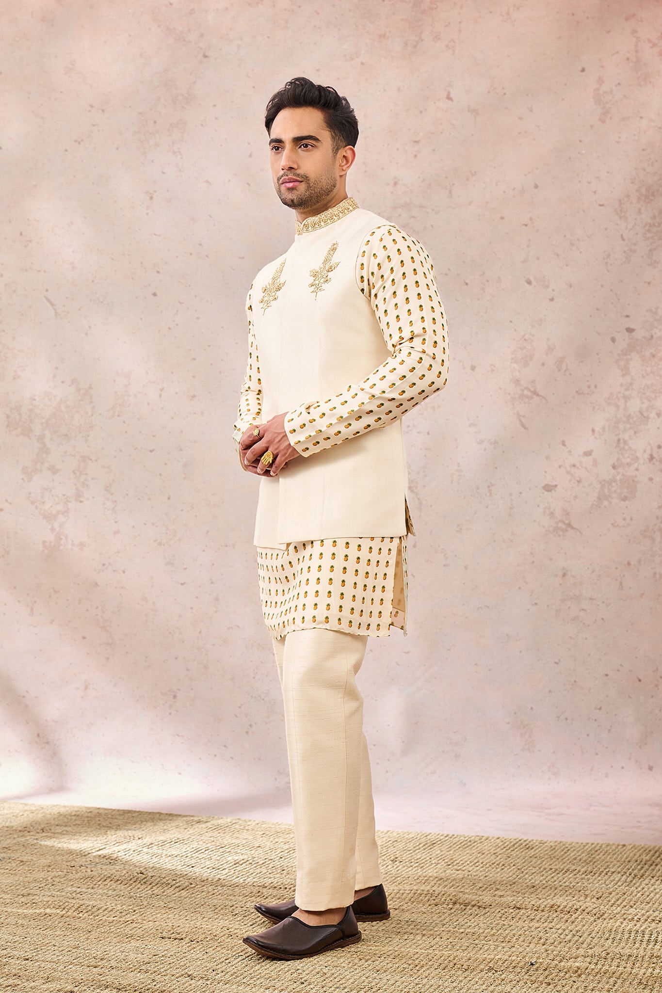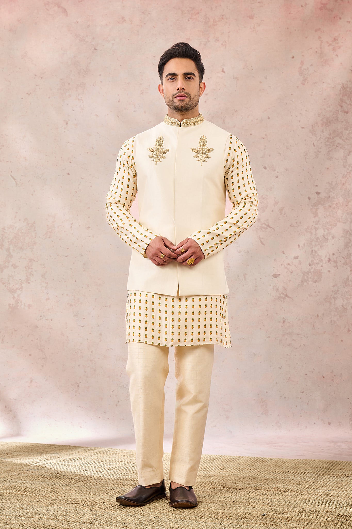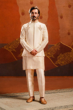 Description:Our Baug Taj motif standing tall and proud on The Kalakand Bandi is perfect for any occasion and festivities. A classic Ivory bandi paired with a printed kurta and smart pants to give a dapper look.