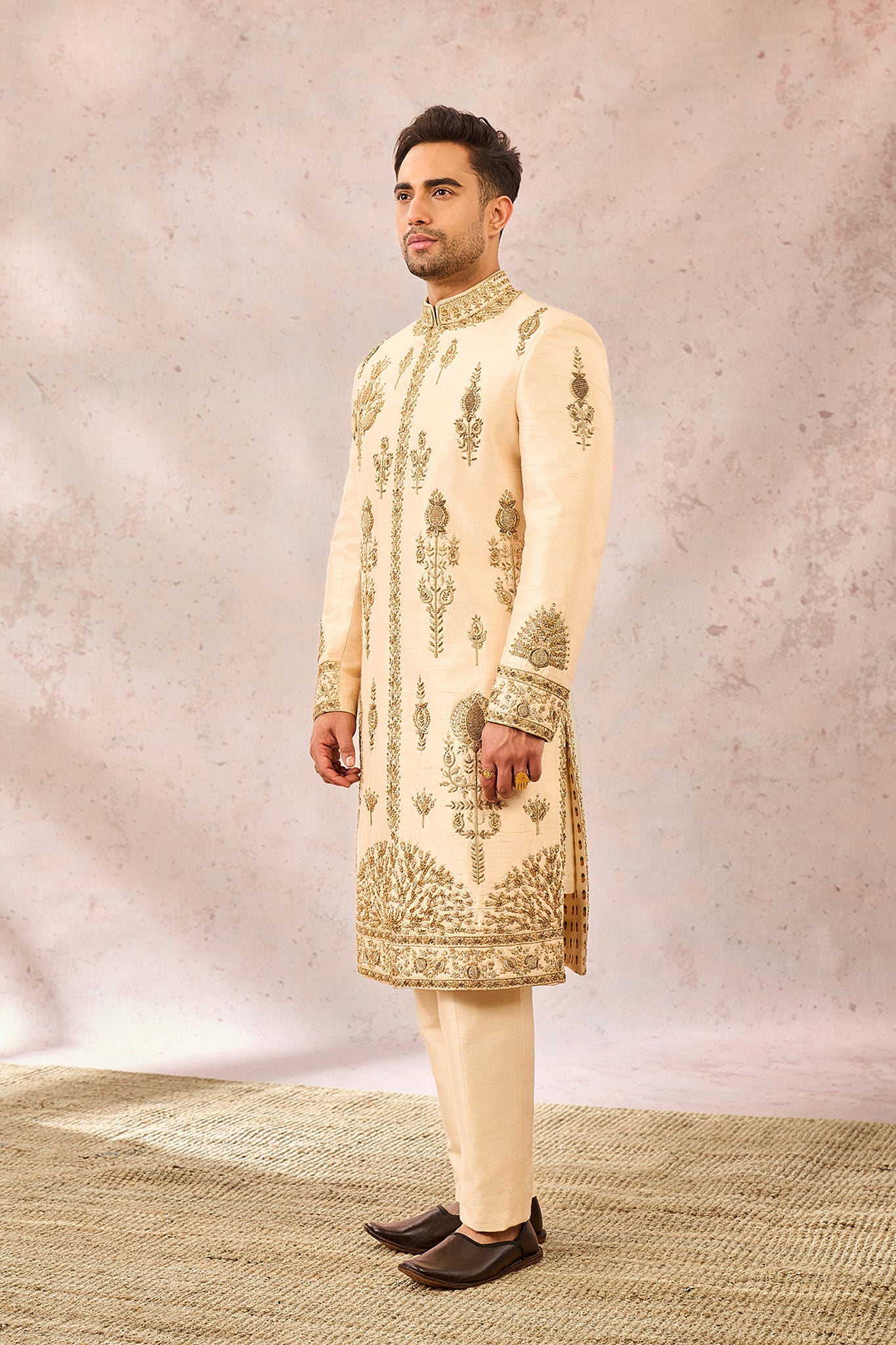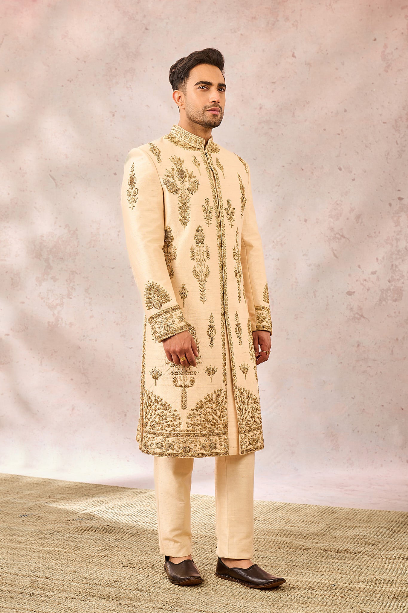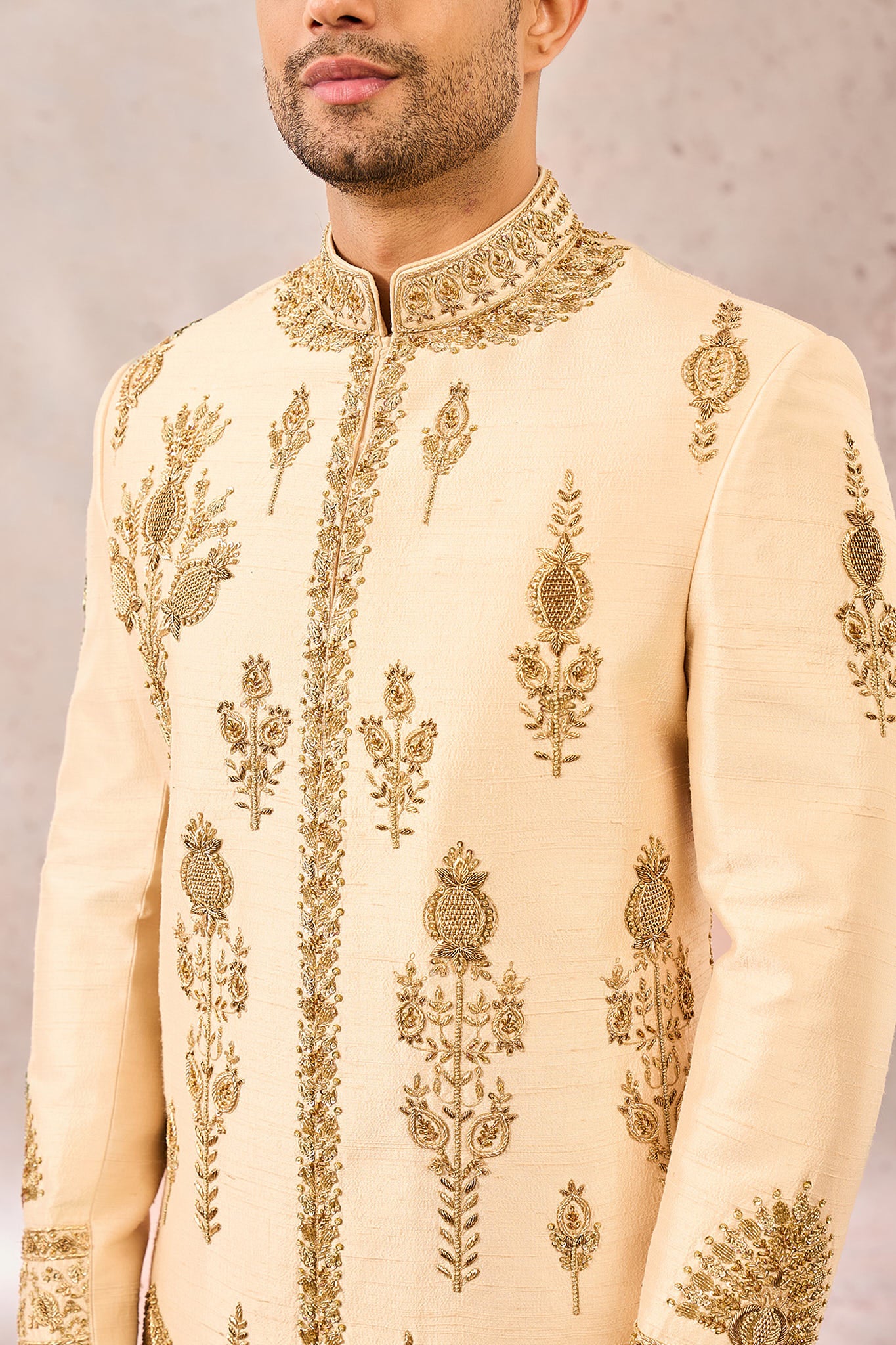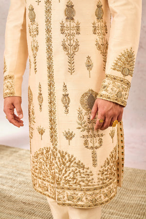 Description:The Regal Matka Kulfi Sherwani in biege is a sooothing yet ornate work of artistry. With the story of the Anarphool running through the sherwani in heavy Zardozi work, This Sherwani is perfect for the grooms-to-be.