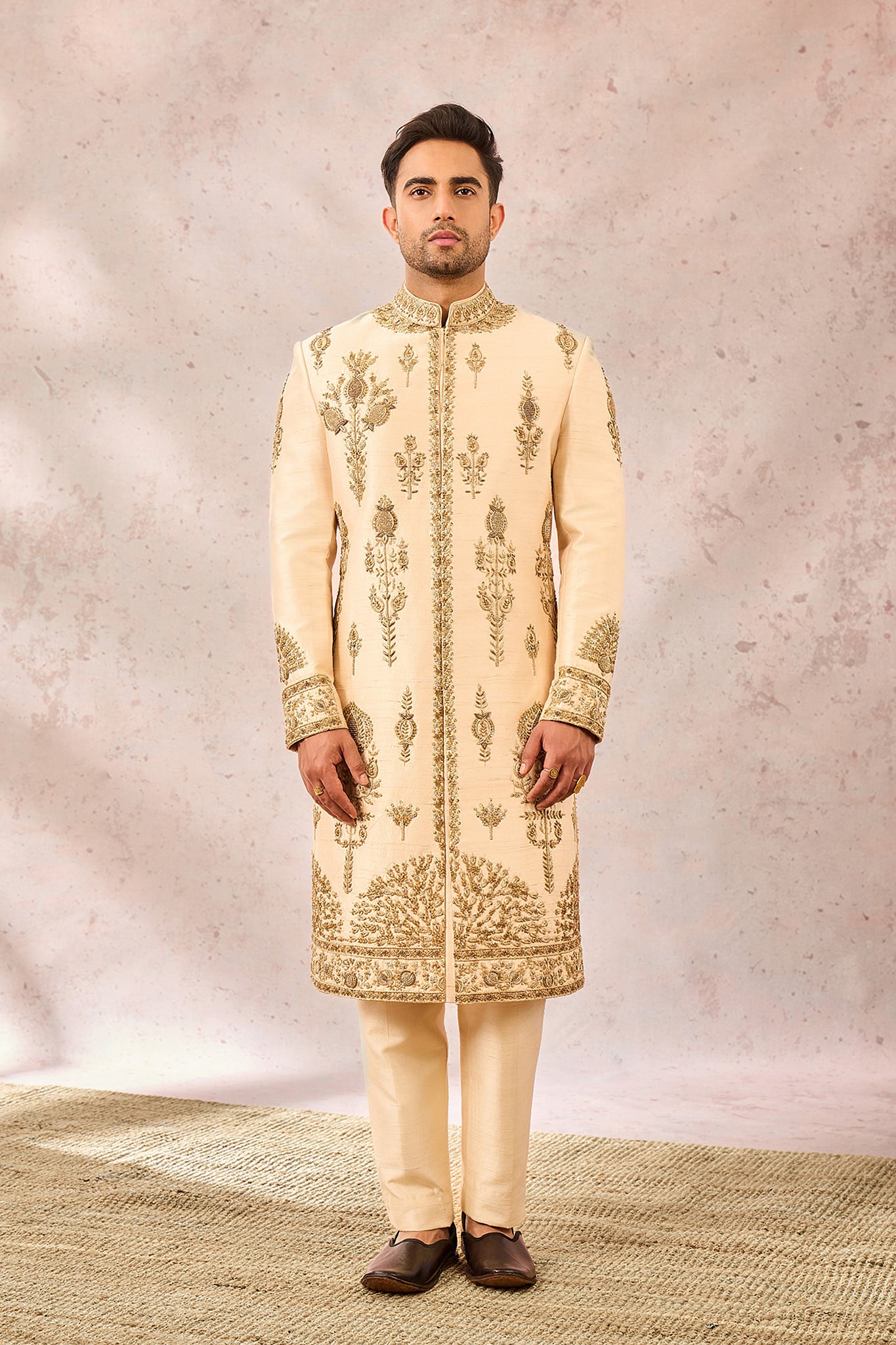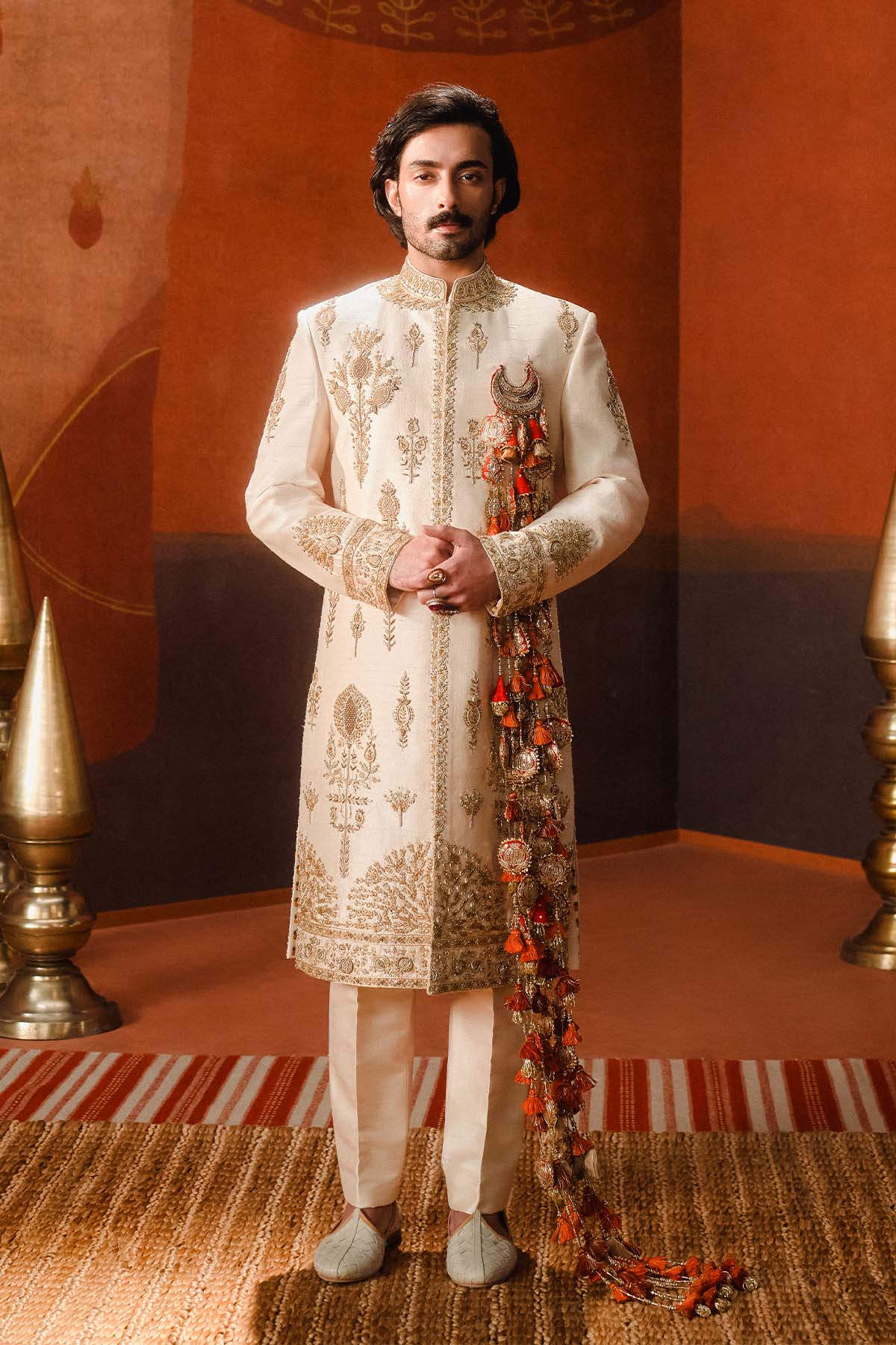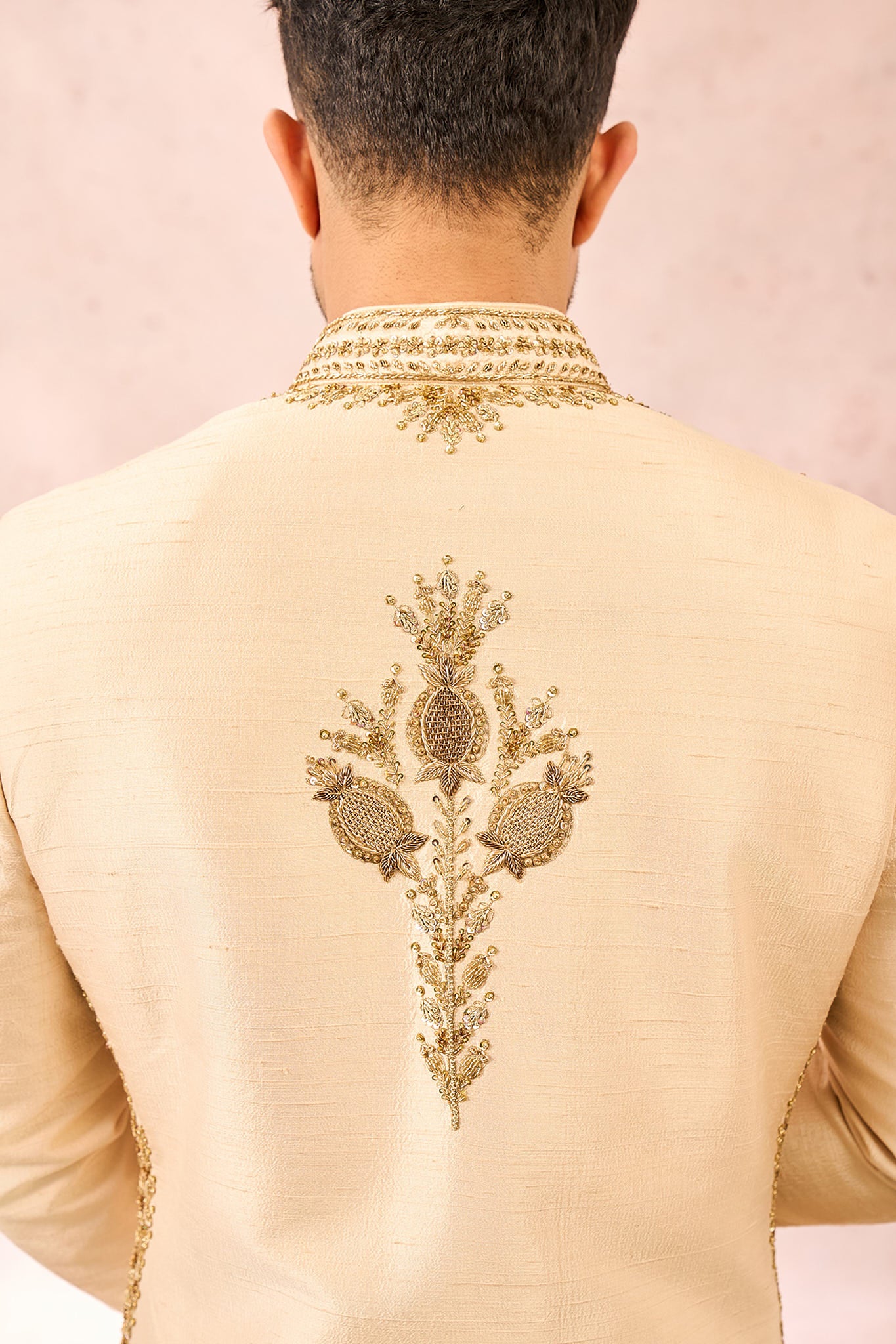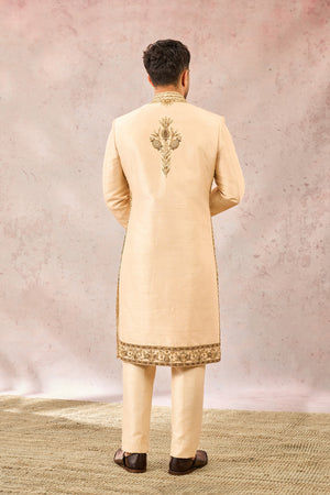Description:The Regal Matka Kulfi Sherwani in biege is a sooothing yet ornate work of artistry. With the story of the Anarphool running through the sherwani in heavy Zardozi work, This Sherwani is perfect for the grooms-to-be.
