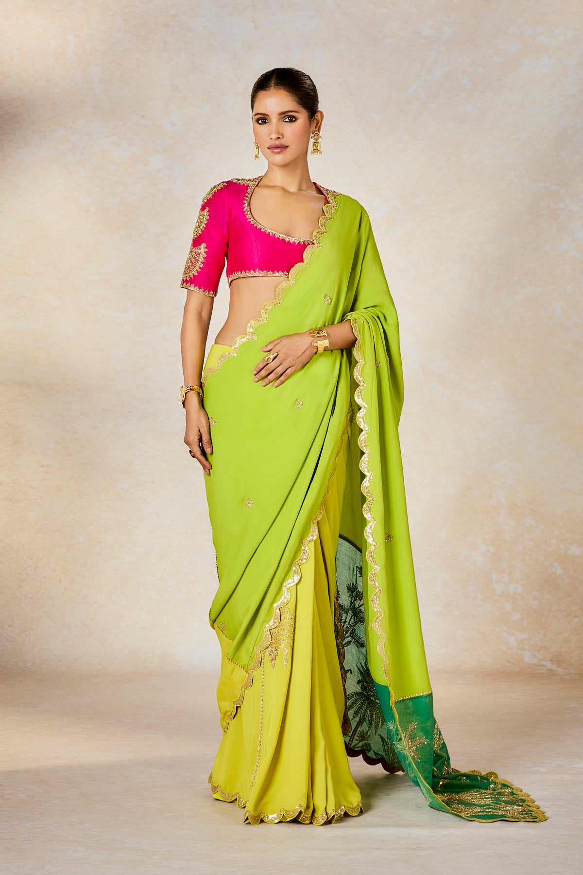 Description:The Meetha Paan saree is a vision in crepe that sways in the richness of tradition. Color blocked in hues of green consisting of a melange of motifs like the Sehra and Nirjara Pushp embroidered in gold on the pallu as well as the pleats. Paired with a scoop neck choli, embellished heavily with our Raj Pankh motif, this saree is a unique addition to any trousseau.
