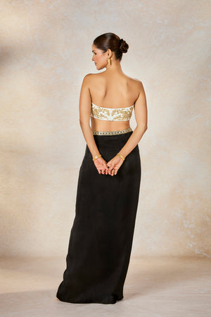 Details: Blazer- The blazer is embellished with embroidery inspired by 'Berry Bel' motifs | A- line | Centre front opening | V-neckline | Full Sleeves | Ankle length Bustier- Strapless tube with center back opening | Adoned with 'Berry Bel' embroidery motifs Drape Skirt- Ankle length skirt with drape detail at the side seam | Side seam Opening