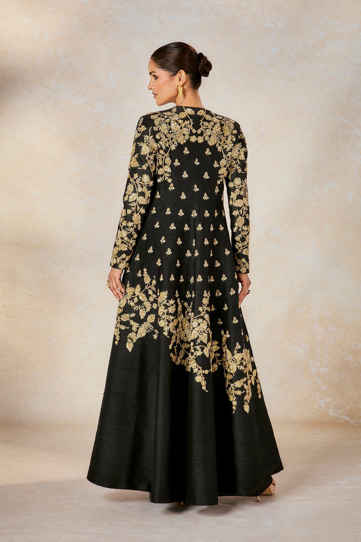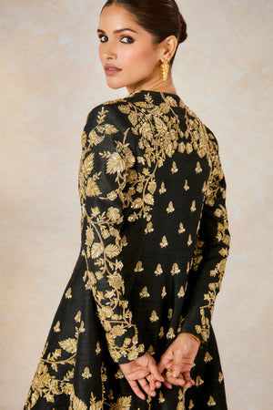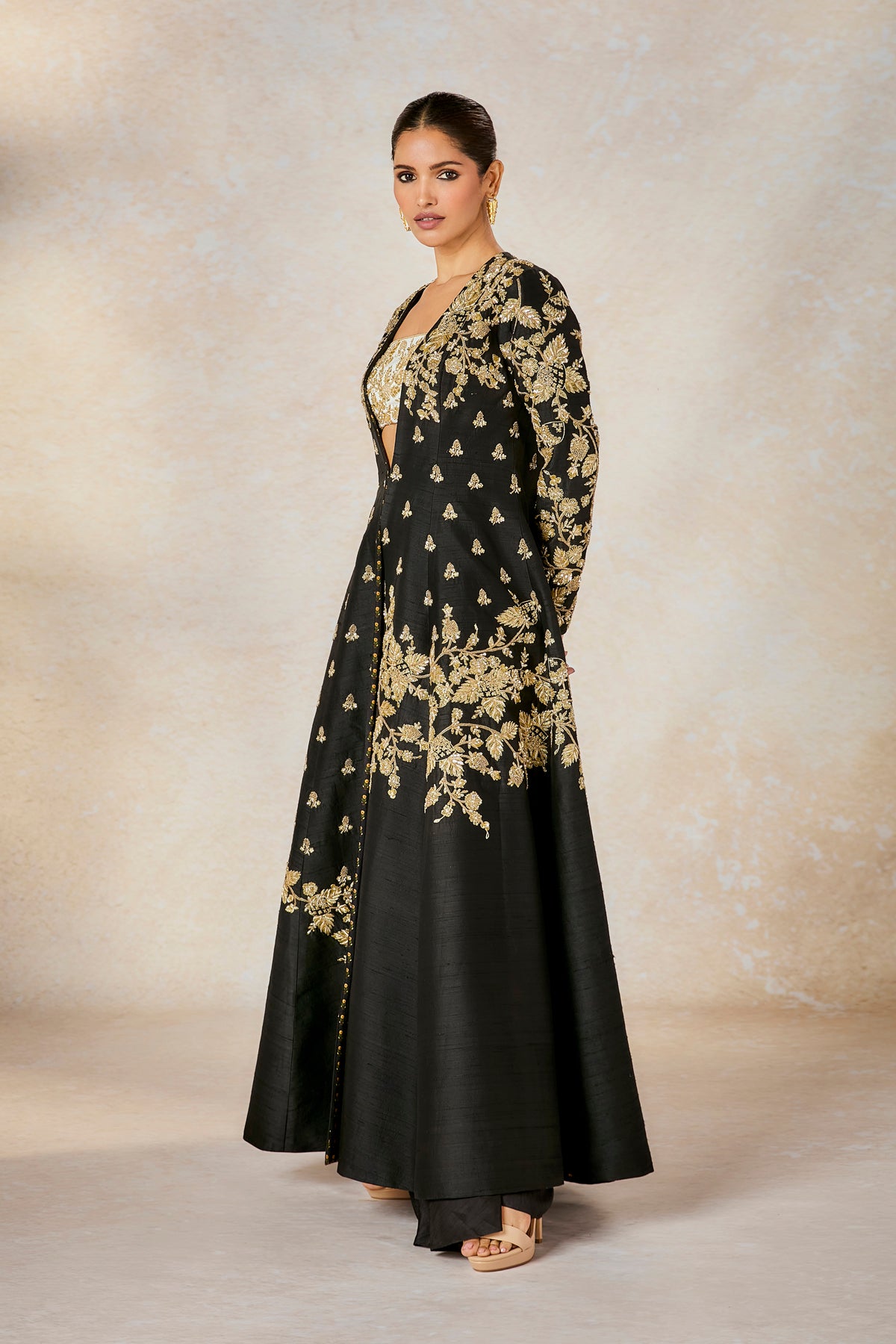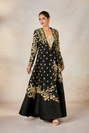 "Description:The Raat Rani Jacket Set, a fusion outfit that blends traditional artistry with contemporary style. This captivating ensemble features an ankle length blazer, richly embroidered with zardozi, moti work, reflecting the opulence of Indian craftsmanship. The blazer is adorned with enchanting motifs like the 'Berry Bel', symbolizing grace and natural beauty, making this piece truly one-of-a-kind. The ensemble is completed with a draped skirt, with a drape detail that adds a modern flair to the traditional silhouette. It is paired with a white bustier adorned with 'Berry Bel' motifs. The Raat Rani Jacket Set is perfect for those who seek to make a statement with timeless elegance and a touch of whimsy, ideal for weddings, festive occasions, or any event where you wish to stand out with grace and charm."