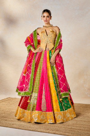 Description:Inspired by the age old craft of patchwork originating from the vibrant rural communities of Kutchch, The Rainbow Barfi lehenga is colorful, vibrant and exuding regality. 10 different prints, 5 different motifs come together to create artistry. Styled with a butterfly style corset blouse designed in tissue and embelished with Dori, dabka & moti kaam. Comes with a separate can can.