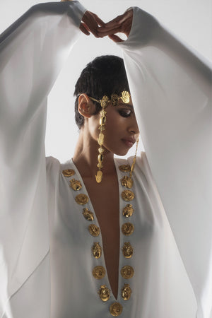 Details: The rann kaftan billows gracefully with each movement, crafted with airy and delicate fabric. The neckline gilded with gold house mascots adds a touch of beauty to the simple yet captivating ensemble.