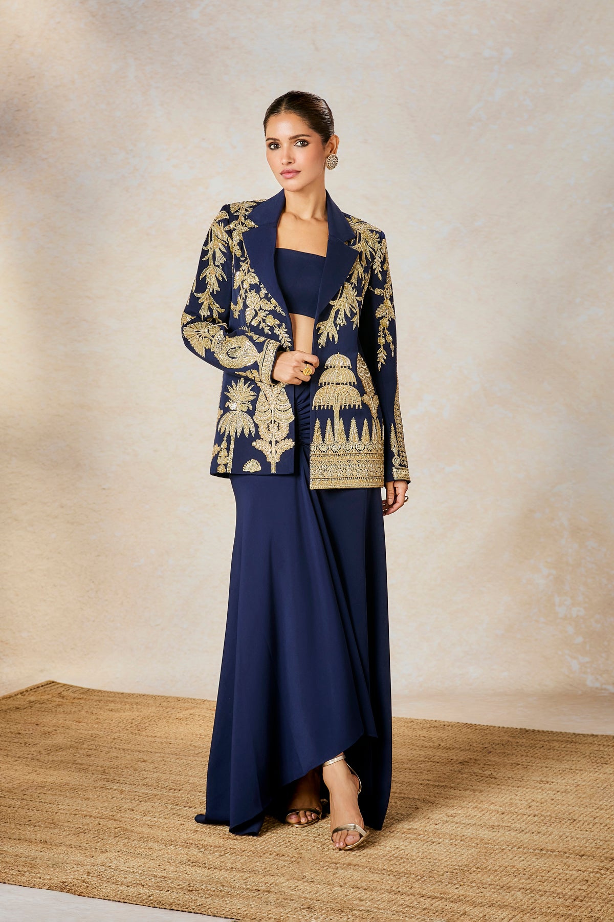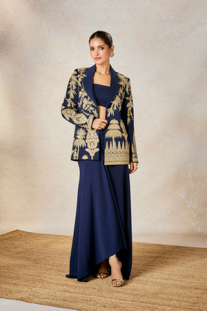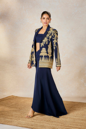 Details: Blazer- The blazer is embellished with embroidery inspired by 'Kusum Kali', 'Son Chaya' and 'Sehra' motifs | Centre front opening | Lapel Collar | Full Sleeves with Shoulder Pads Bustier- Strapless tube with center back opening Drape Skirt- Ankle length skirt with drape detail at the centre front | Side seam Opening