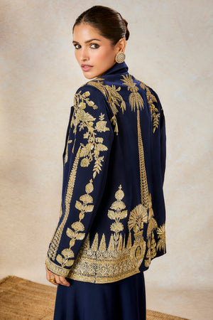 "Description: The Sanjh Bagh Blazer Set, a fusion outfit that blends traditional artistry with contemporary style. This captivating ensemble features a blazer, richly embroidered with zardozi, moti work, reflecting the opulence of Indian craftsmanship. The blazer is adorned with enchanting motifs like the 'Kusum Kali', 'Son Chaya' and 'Sehra', symbolizing grace and natural beauty, making this piece truly one-of-a-kind. The ensemble is completed with a draped skirt, with a drape detail that adds a modern flair to the traditional silhouette. The Sanjh Bagh Blazer Set is perfect for those who seek to make a statement with timeless elegance and a touch of whimsy, ideal for weddings, festive occasions, or any event where you wish to stand out with grace and charm."