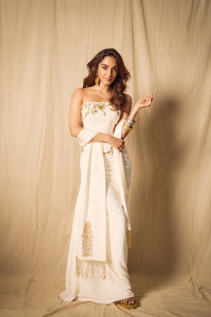 Description:Introducing The Thandai Corset Set, a captivating Indian fusion ensemble that blends traditional opulence with modern allure. This set features a structured corset, intricately adorned with gold embroidery inspired by the elegant 'Berry Bel' motif. The corset's design is elevated with exquisite gold work, crafted using zardozi, sequins, katdana and moti embroidery, creating a shimmering masterpiece that radiates sophistication.