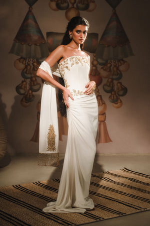 Paired with the corset is a draped skirt that adds a graceful flow to the ensemble, perfectly balancing the structured top. Completing the look is a delicate stole, adorned with two charming 'Anasam Phool' inspired motifs embroidered on the hemline, adding a playful yet refined touch. The Thandai Corset Set is ideal for festive occasions, weddings, or any event where you want to make a striking statement with a blend of tradition and contemporary style."