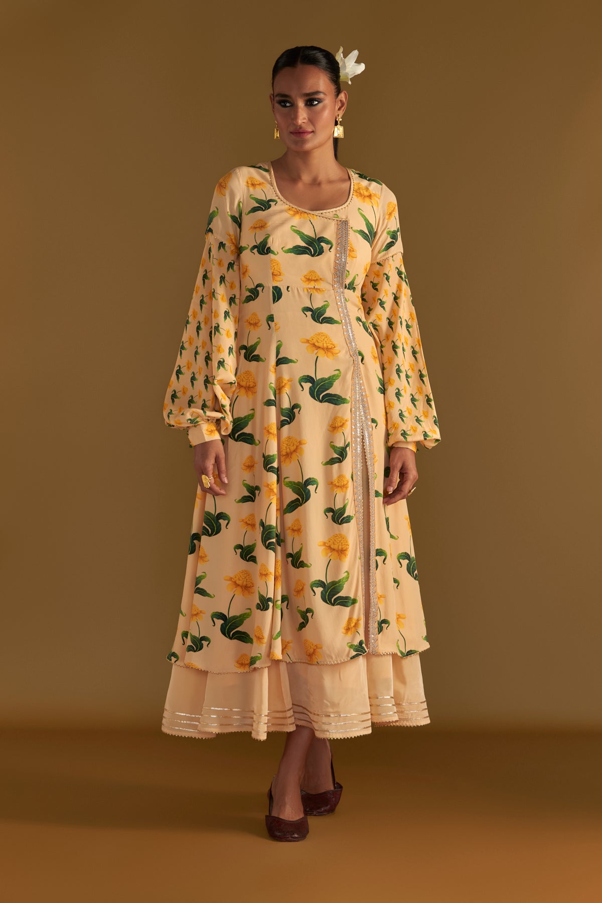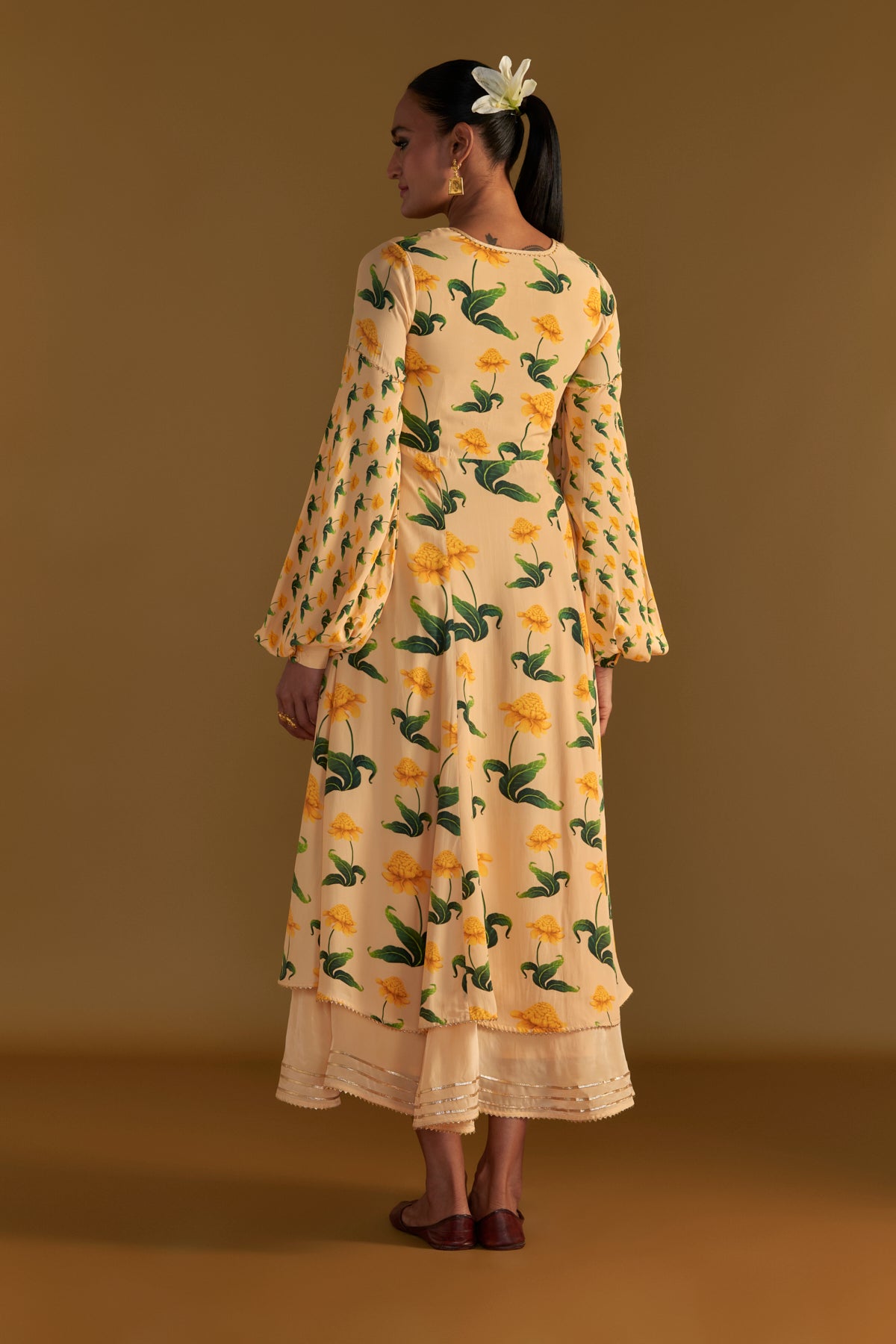 Details: Vanilla Poppy Petal Kurta Dress - Digital printed kurta dress | Layered hemline | Embellished with border and edged with kinari | Balloon sleeves