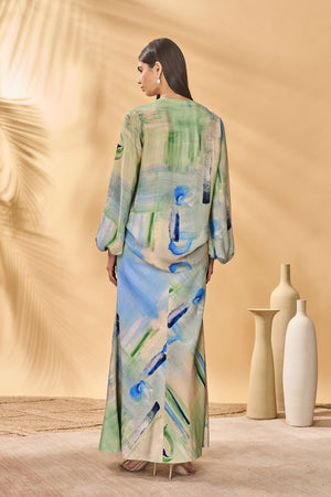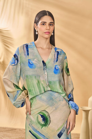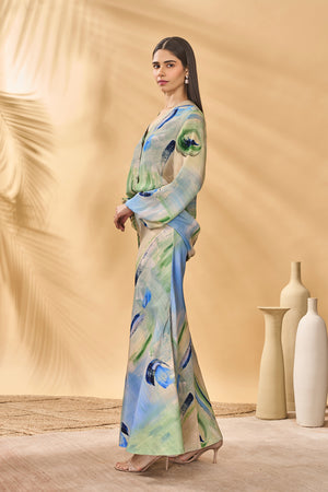 Details: Top- V-neck | Front button closure | Bellowy Sleeves Skirt- Trumpet skirt | Maxi length | Side zipper