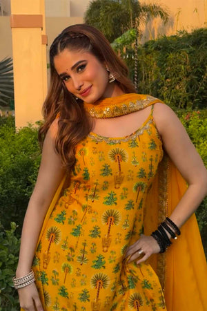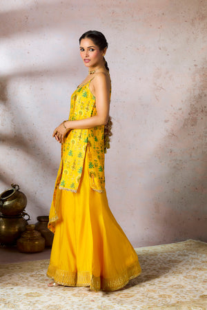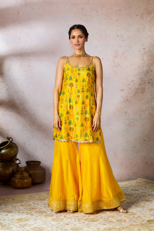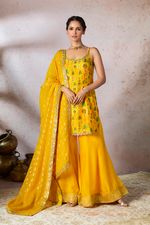 Details: Kurta - All over printed spaghetti kurta embellished with embroidered borders | Adjustable straps | Side seam closure Sharara- Semi-Fitted Sharara embellished with embroidered borders | Side seam opening Dupatta- All over foil printed organza dupatta | Embellished with embroidered border and edged with kinari