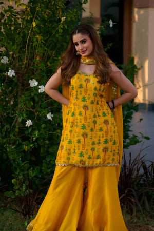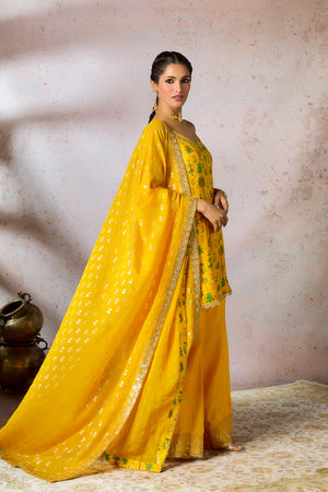Styling: Pair the Sharara set with statement gold or antique jewelry and mojris. Style it with our beautiful foil printed organza dupatta draped elegantly over one shoulder for a more elevated look. Accessorize it with a beautiful potli bag.