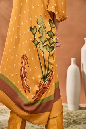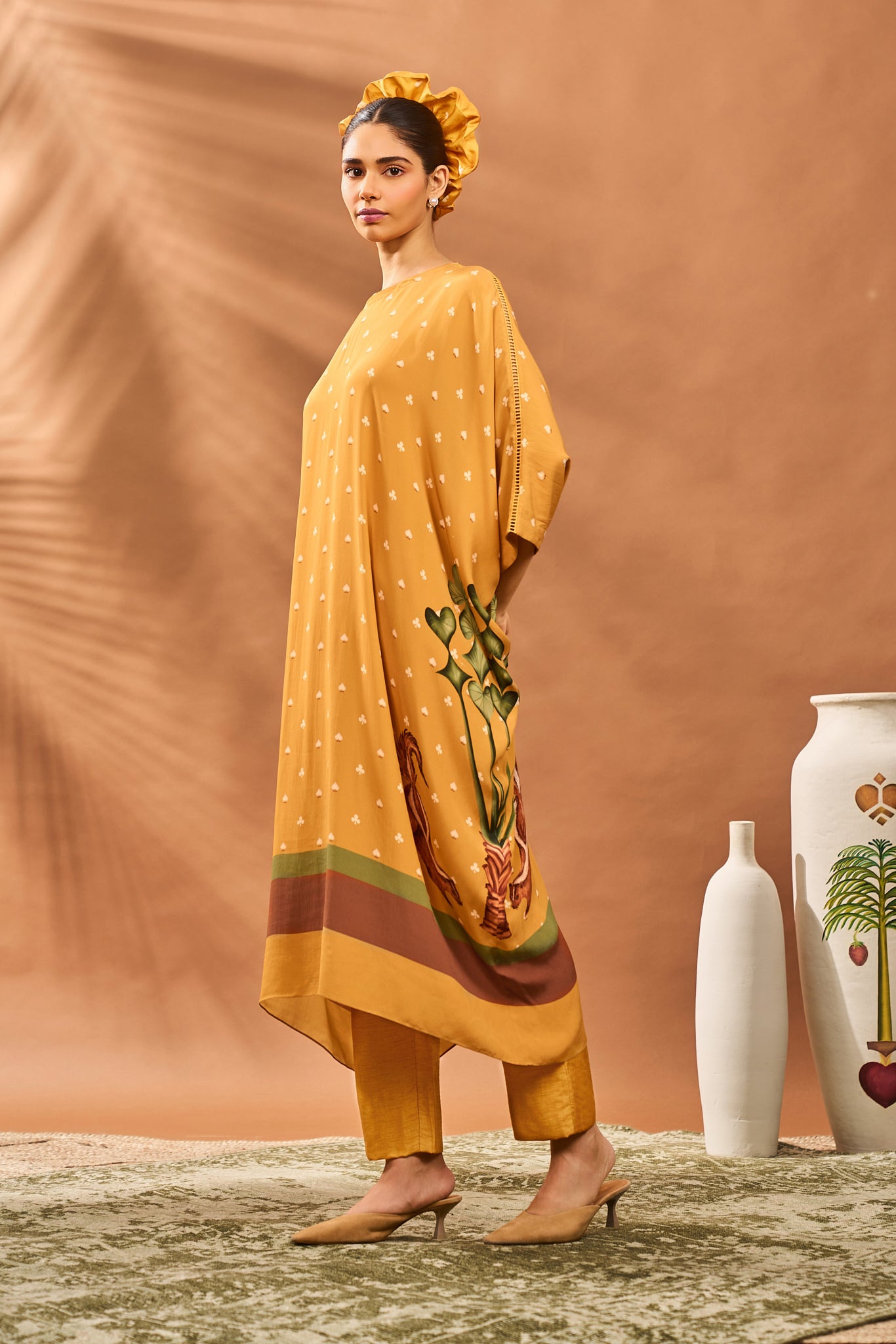 Details: Tunic- High and low all over printed tunic | A-line| Round neckine | Crochet Detail on the sleeves | Center back closure Pant- Yellow straight pants | Side seam closure