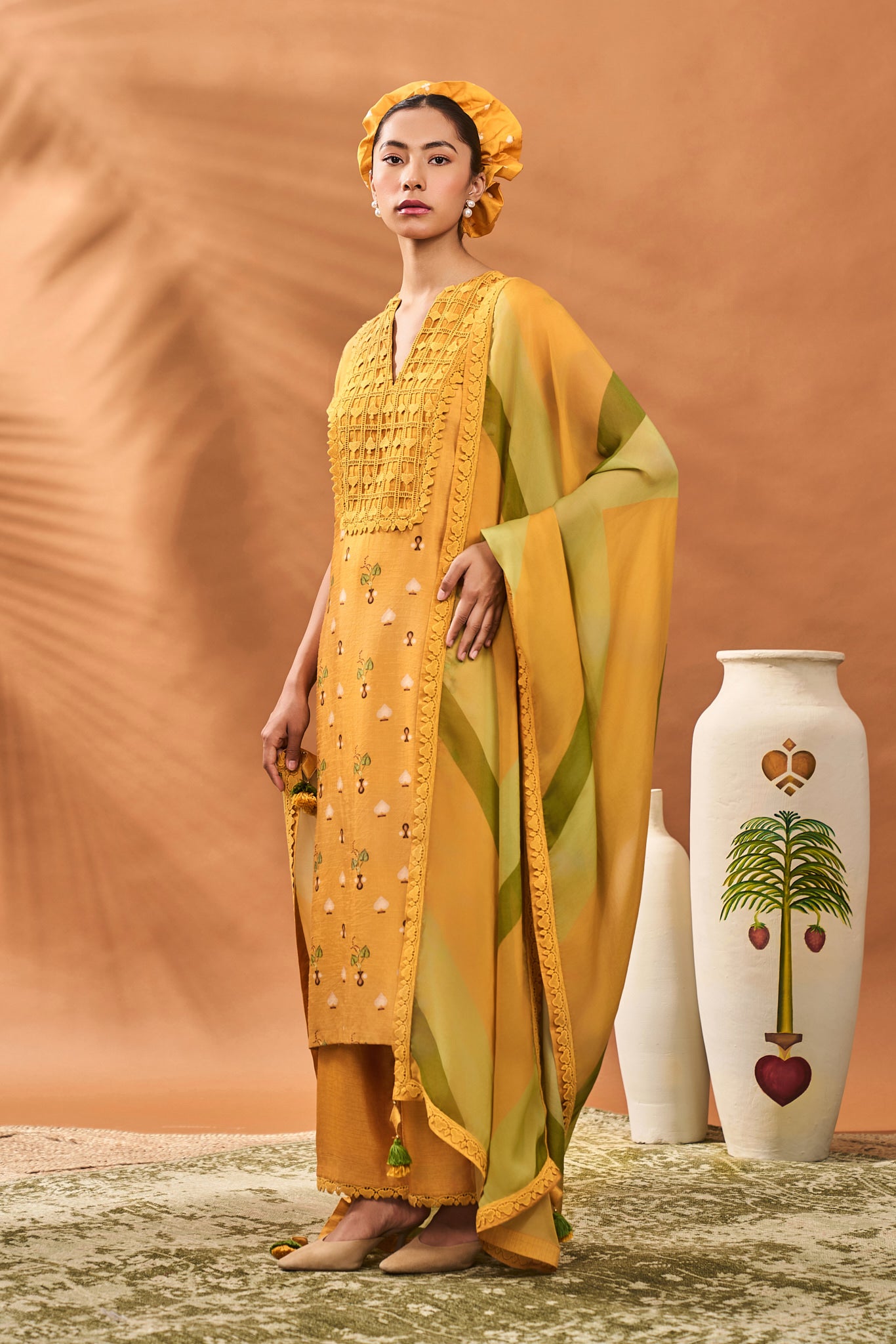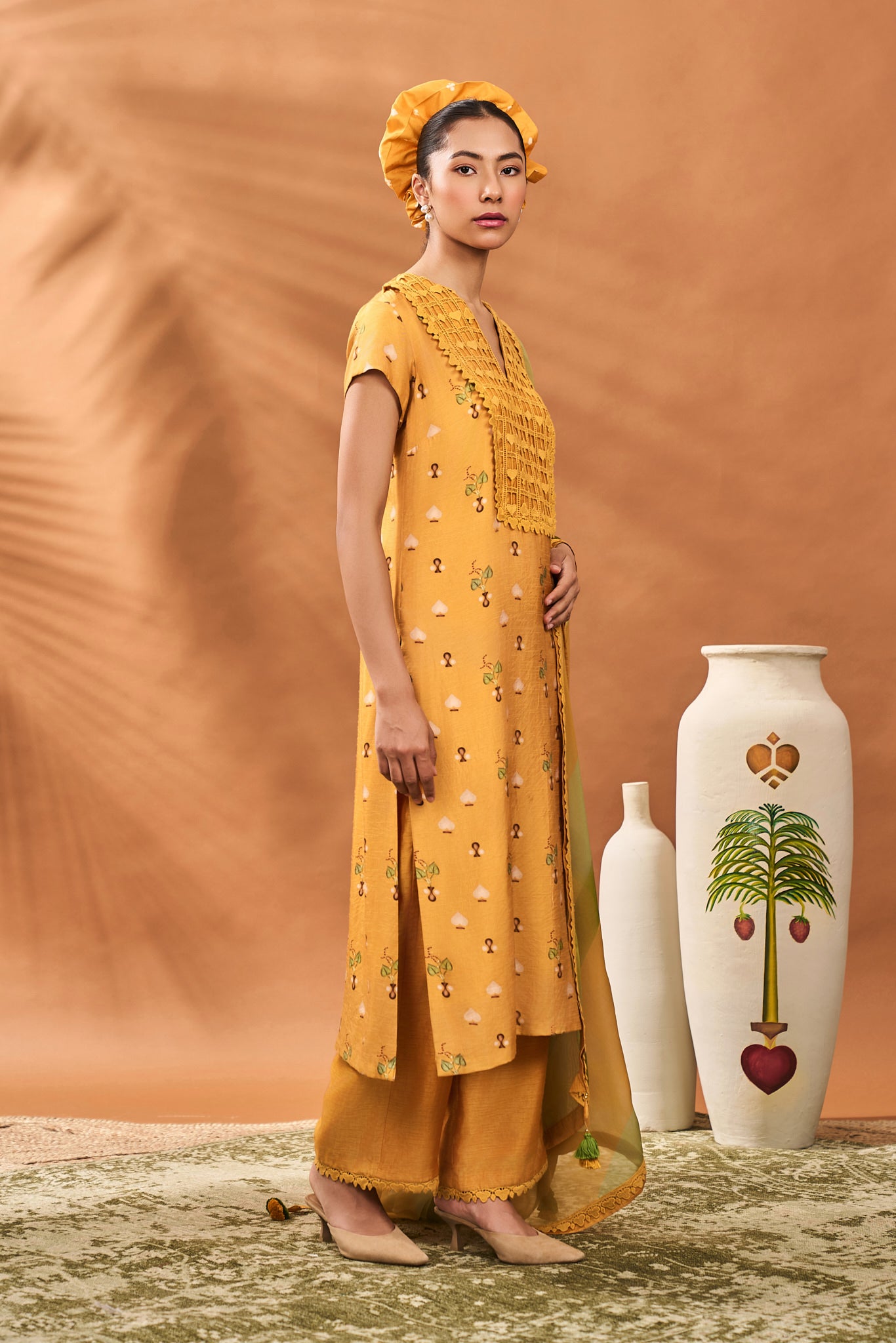 Styling: Pair this beautiful Kurta set with a pair of statement earrings and mojris. Style it with our beautiful organza dupatta draped elegantly over one shoulder for a more elevated look. Accessories it with a potli bag.