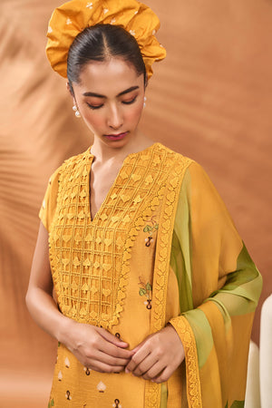 Details: Kurta- All over digital printed straight kurta with yoke | Yoke is embellished with tone on tone crochet fabric and border| Calf Length | Caftan neckline | Cap Sleeves | Side Seam Opening Pant- Yellow straight pants embellished with crochet border at the hem | Side seam closure Dupatta- Printed organza dupatta | Embellished with crochet border and tassles
