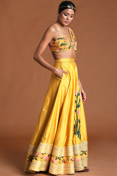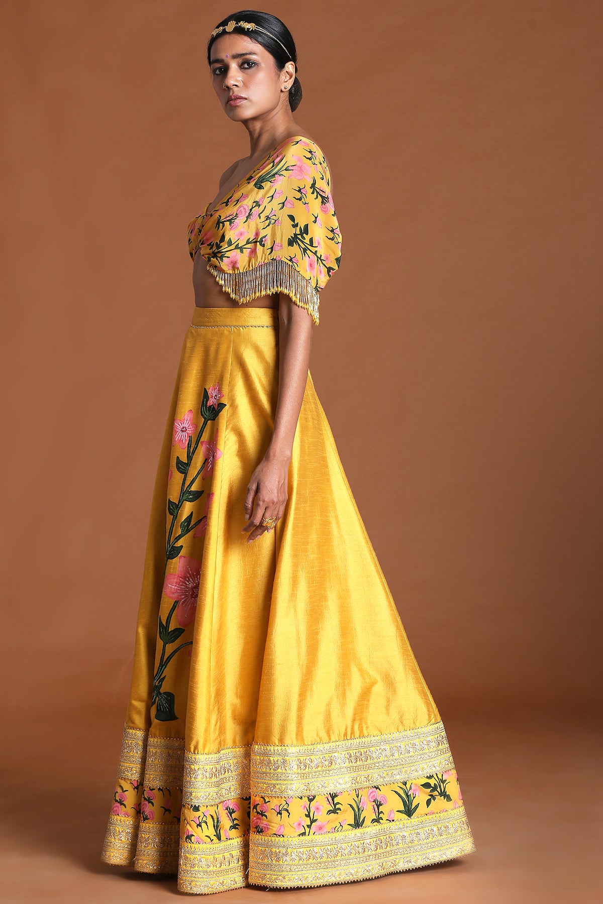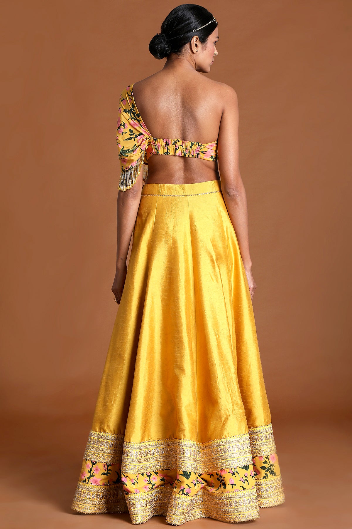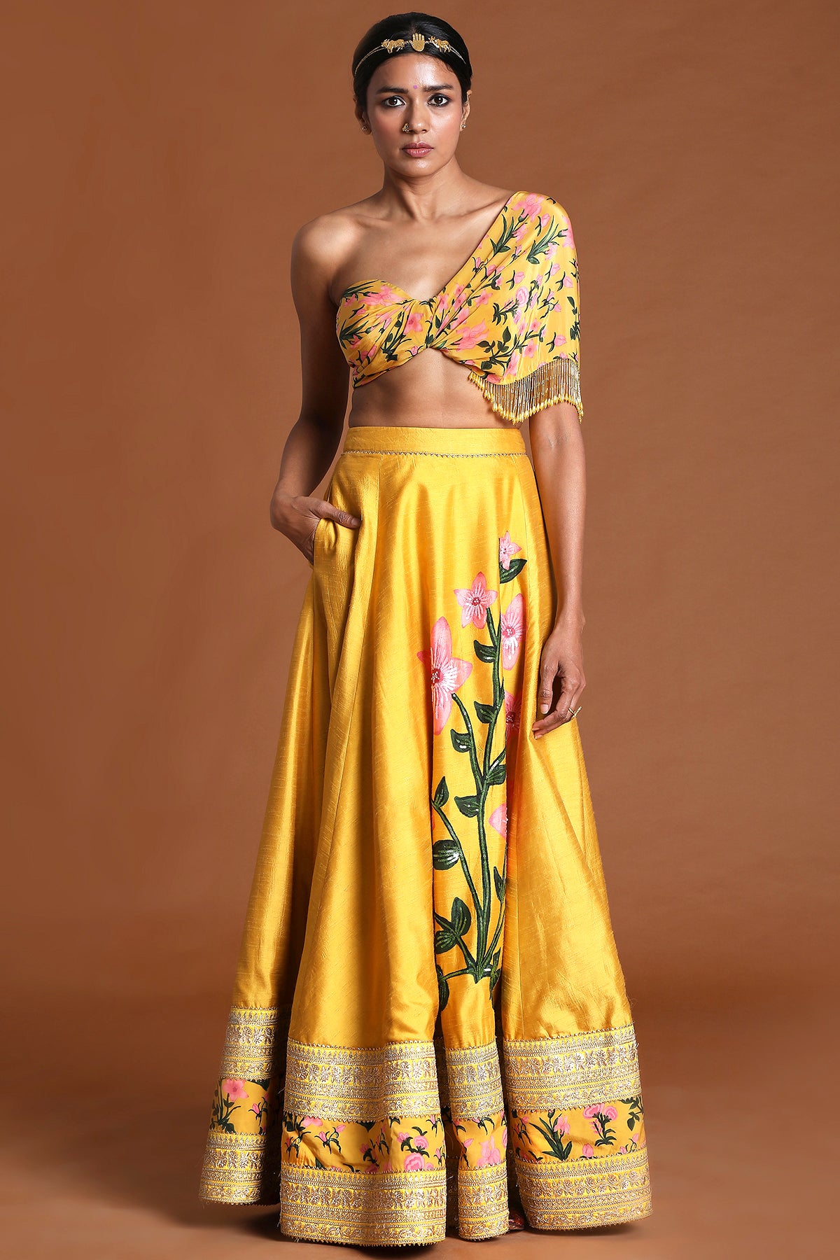 Details: Zinnia Lehenga - One -shoulder twisted blouse | Bead Tassel detailing | Embellished lehenga hem | Placement motif with sequin highlight detailing on lehenga