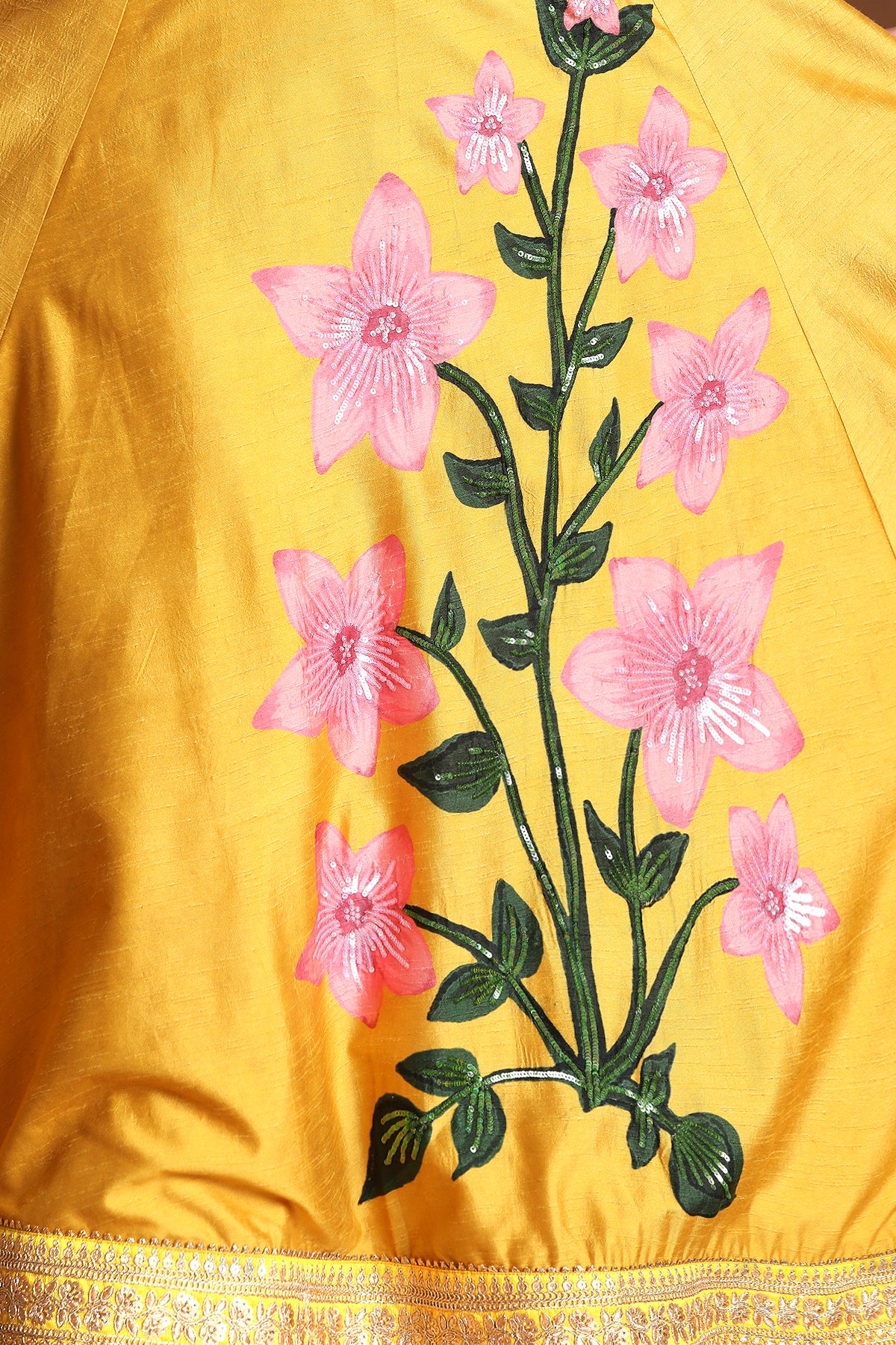 Styling: Style this Yellow Floral Lehenga with our statement matha patti, ring and comfortable heels